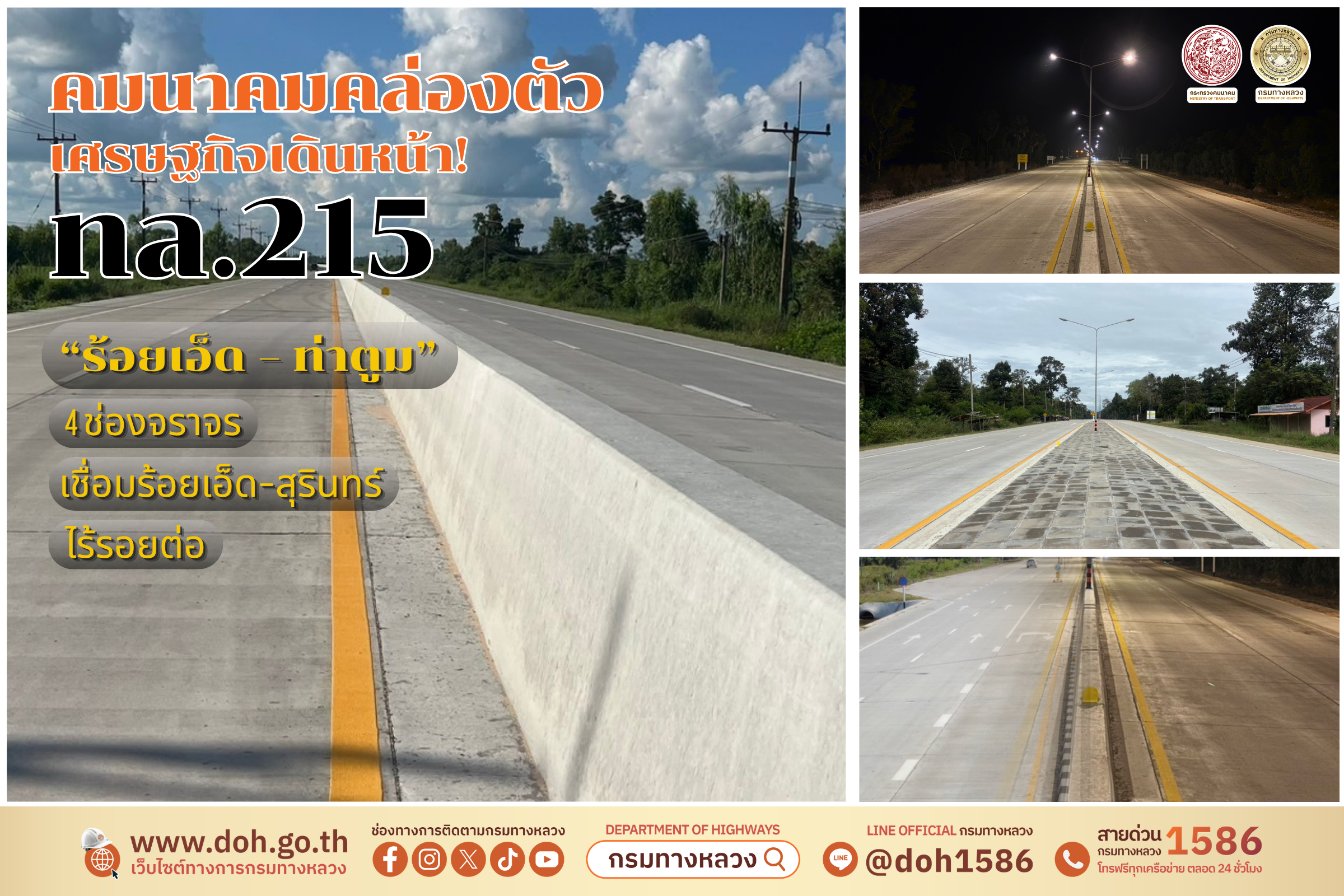 คมนาคมคล่องตัว เศรษฐกิจเดินหน้า! ทล.215 “ร้อยเอ็ด – ท่าตูม” 4 ช่องจราจร เชื่อมร้อยเอ็ด–สุรินทร์ ไร้รอยต่อ