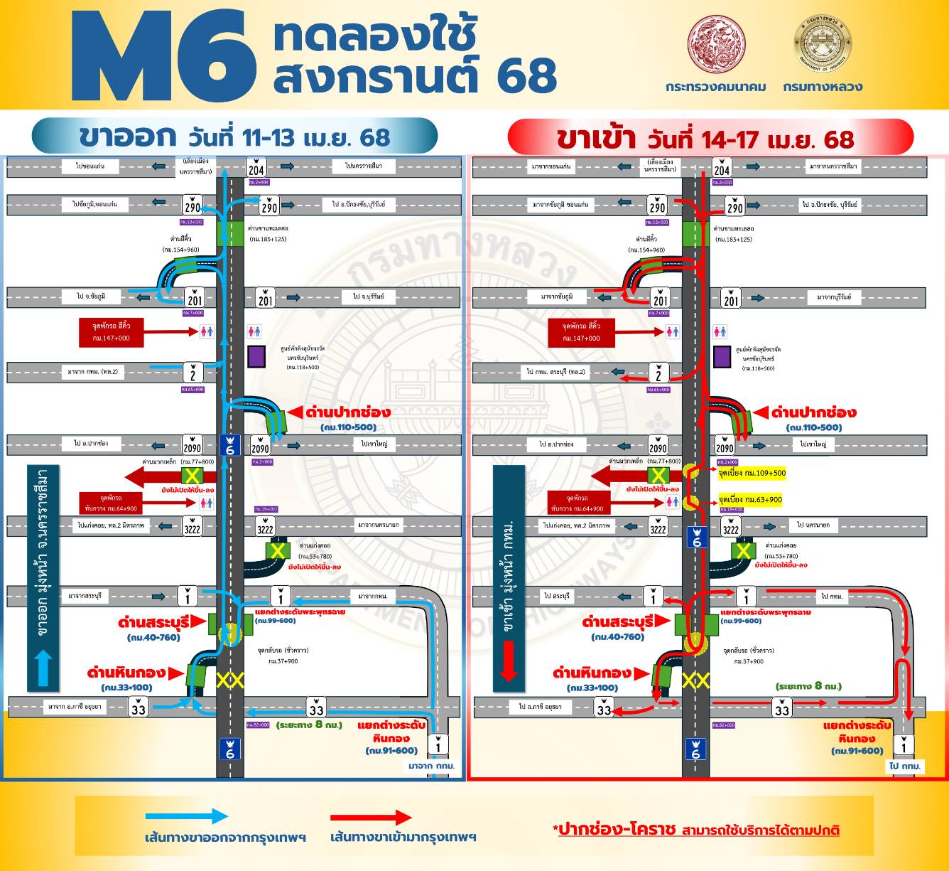 สงกรานต์ 68: กรมทางหลวงเปิดให้ทดลองวิ่งฟรี! ทางหลวงพิเศษหมายเลข 6 (M6) ช่วงหินกอง - นครราชสีมา ตลอด 24 ชั่วโมง พร้อมรายละเอียดจุดขึ้น - ลง และแนะนำในการวางแผนการเดินทางล่วงหน้า