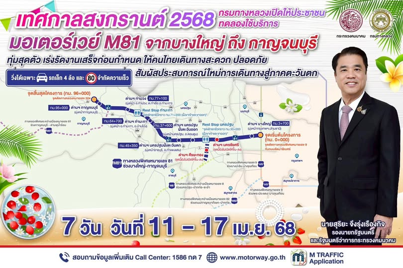 “กรมทางหลวง” เผย M81 สายบางใหญ่- กาญจนบุรี เปิดแล้ว! เริ่มให้วิ่ง ทุกวันศุกร์ถึงวันจันทร์ มั่นใจปลายต.ค.นี้ ให้สัญจรฉลุยทุกวันไร้ค่าธรรมเนียม ขานรับโยบาย “สุริยะ” ทุกโครงสร้างพื้นฐานอย่างมีประโยชน์สูงสุด - ต้องปลอดภัย-สะดวกทุกเส้นทาง พร้อมระบุ M81 เดินทางจาก กทม.-กาญจนบุรี เหลือเพียง 1 ชม. มั่นใจรถยนต์ใช้สัญจรพุ่งชัวร์