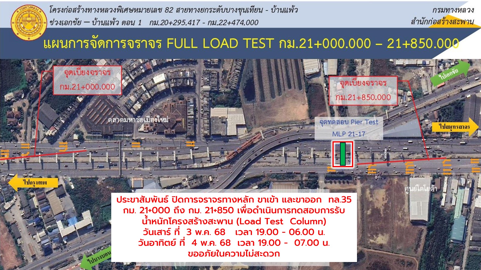 โครงการก่อสร้างทางยกระดับบางขุนเทียน-บ้านแพ้ว ช่วงเอกชัย-บ้านแพ้ว ตอน 1 แจ้งปิดการจราจรชั่วคราวเพื่อทดสอบการรับน้ำหนักโครงสร้าง