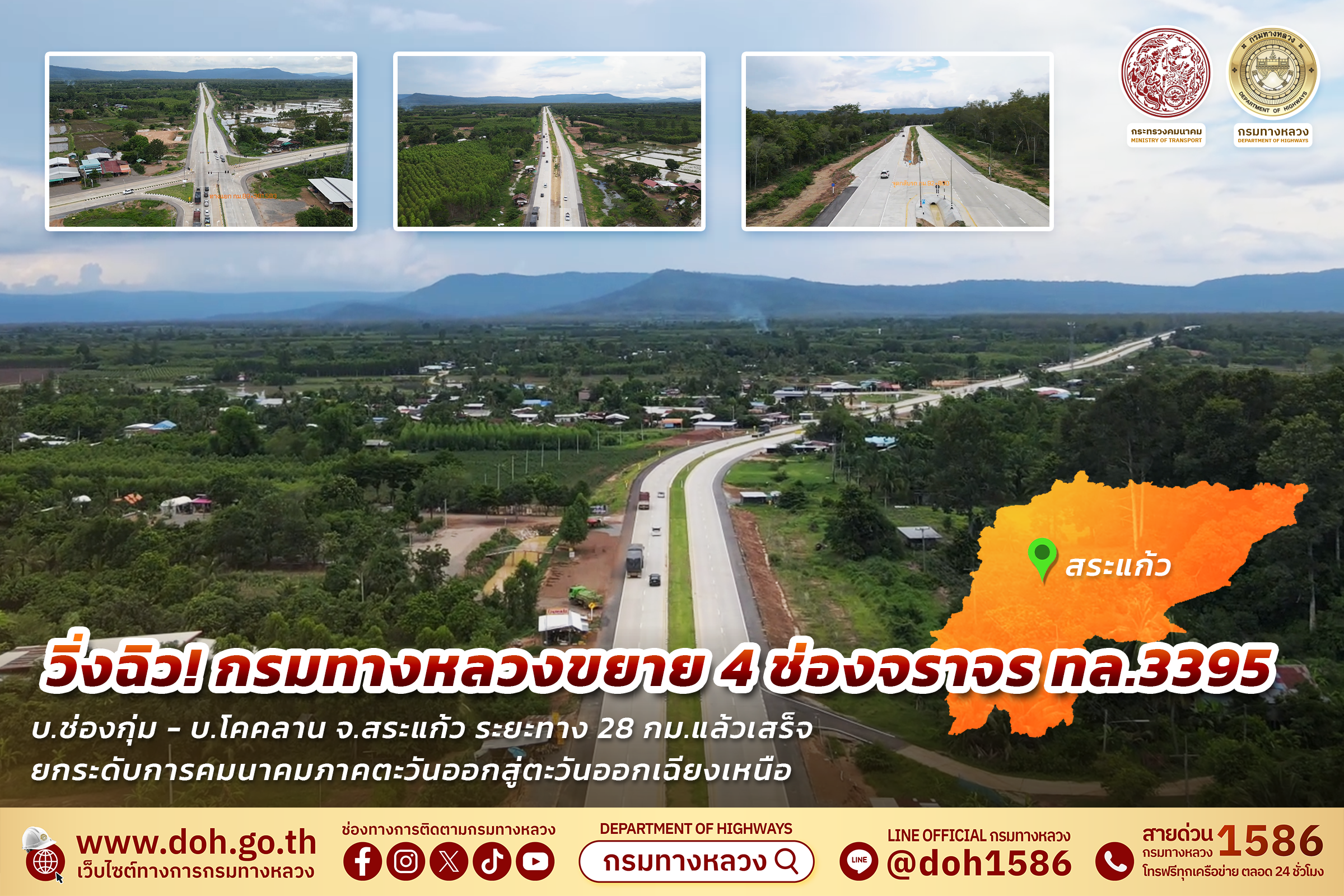 วิ่งฉิว! กรมทางหลวงขยาย 4 ช่องจราจร ทล.3395 สาย บ.ช่องกุ่ม - บ.โคคลาน จ.สระแก้ว ระยะทาง 28 กม. แล้วเสร็จ ยกระดับการคมนาคมภาคตะวันออกสู่ตะวันออกเฉียงเหนือ