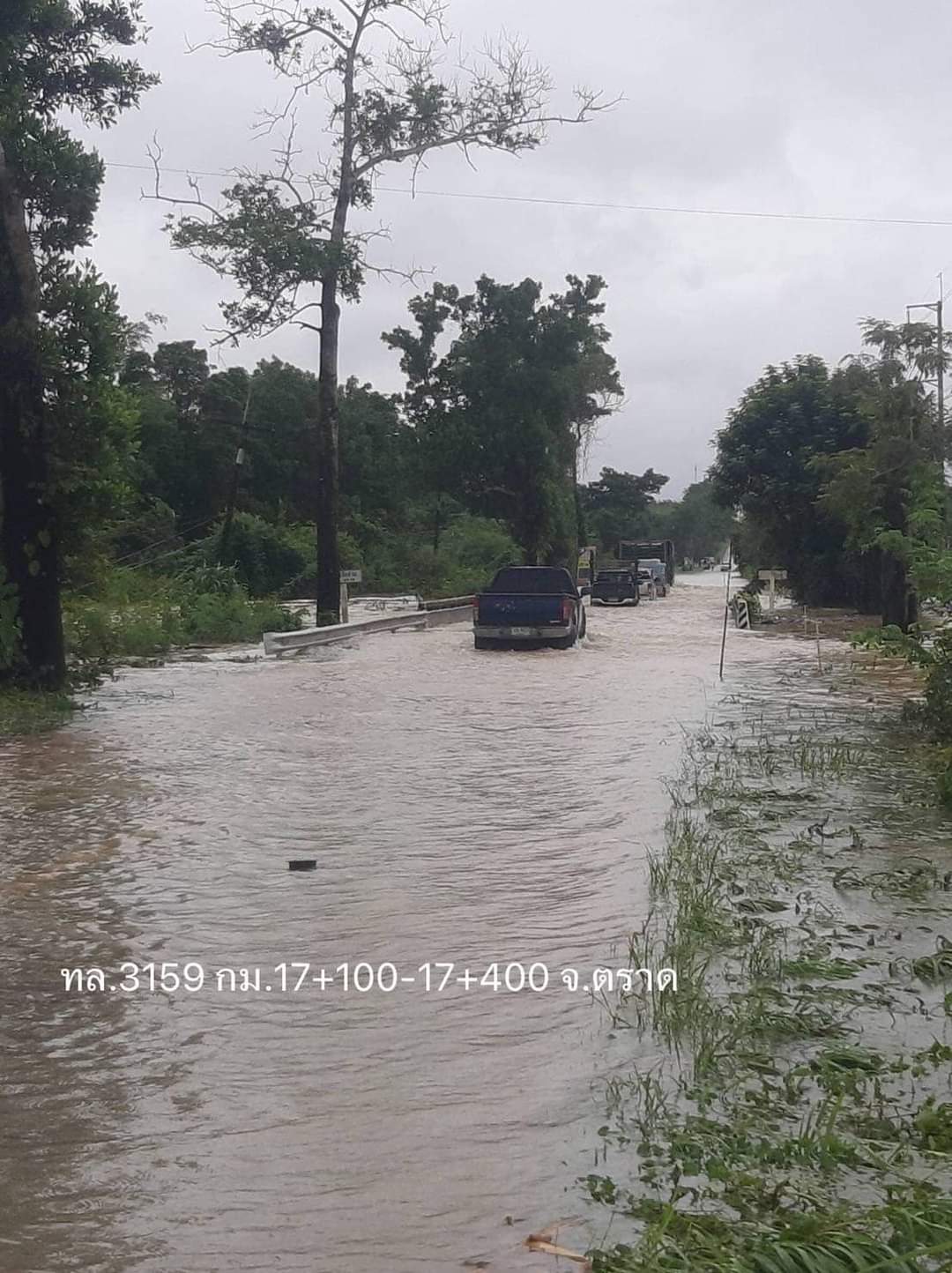 2. ทางหลวงหมายเลข 3157 แสนตุ้ง - หนองบัว ช่วง กม.7+000 – 7+500 ในพื้นที่อำเภอบ่อไร่ จังหวัดตราดระดับน้ำสูง 40 ซม. ทำให้การจราจรผ่านไม่ได้ แนะนำให้ใช้ทางหลวงท้องถิ่นเป็นทางเลี่ยง