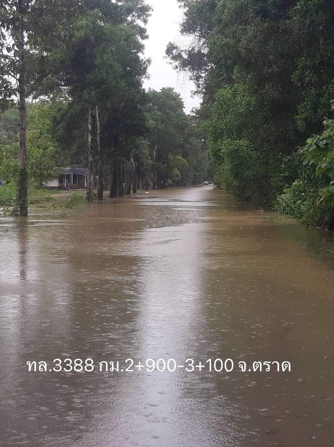 4. ทางหลวงหมายเลข 3388 บ้านโป่ง - บ่อไร่ ช่วง กม.1+900 – 2+300 ในพื้นที่อำเภอเขาสมิง จังหวัดตราด ระดับน้ำสูง 120 ซม. ทำให้การจราจรผ่านไม่ได้ แนะนำให้ใช้ทางหลวงท้องถิ่นเป็นทางเลี่ยง
