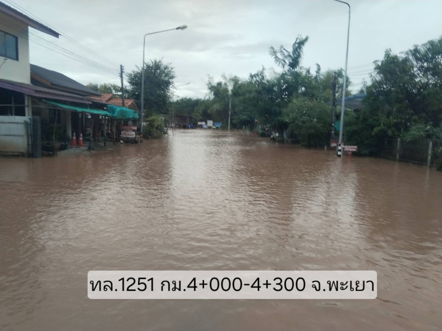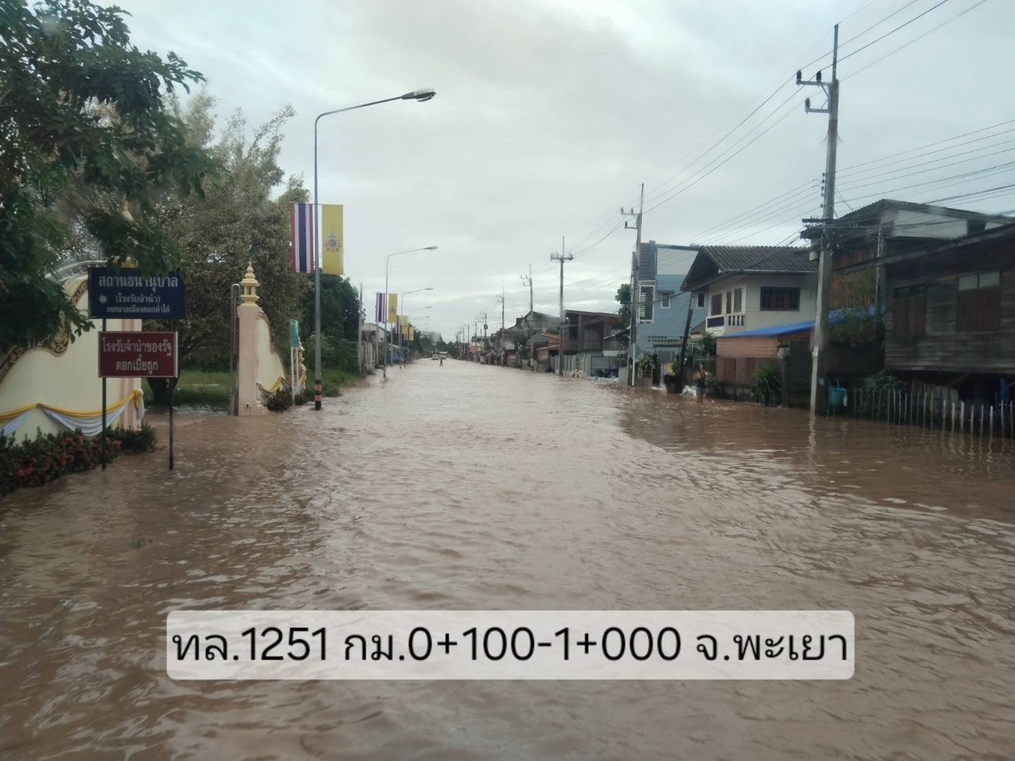 4. ทางหลวงหมายเลข 1251 ดอกคำใต้ – บ้านถ้ำ ช่วง กม.ที่ 0+100 – 1+300 ในพื้นที่อำเภอดอกคำใต้ จังหวัดพะเยา ระดับน้ำสูง 35 - 40 ซม.
