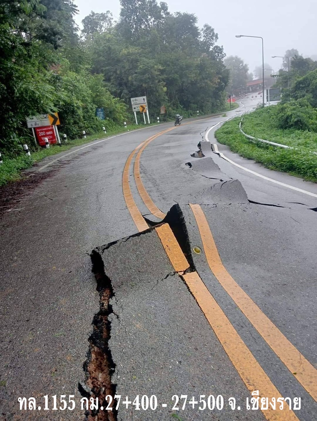 4. ทางหลวงหมายเลข 1155 ทรายกาด – บ้านลุง ช่วง กม.ที่ 27+400 – 27+500 ในพื้นที่อำเภอเทิง จังหวัดเชียงราย ดินสไลด์ทำให้คันทางทรุดตัว
