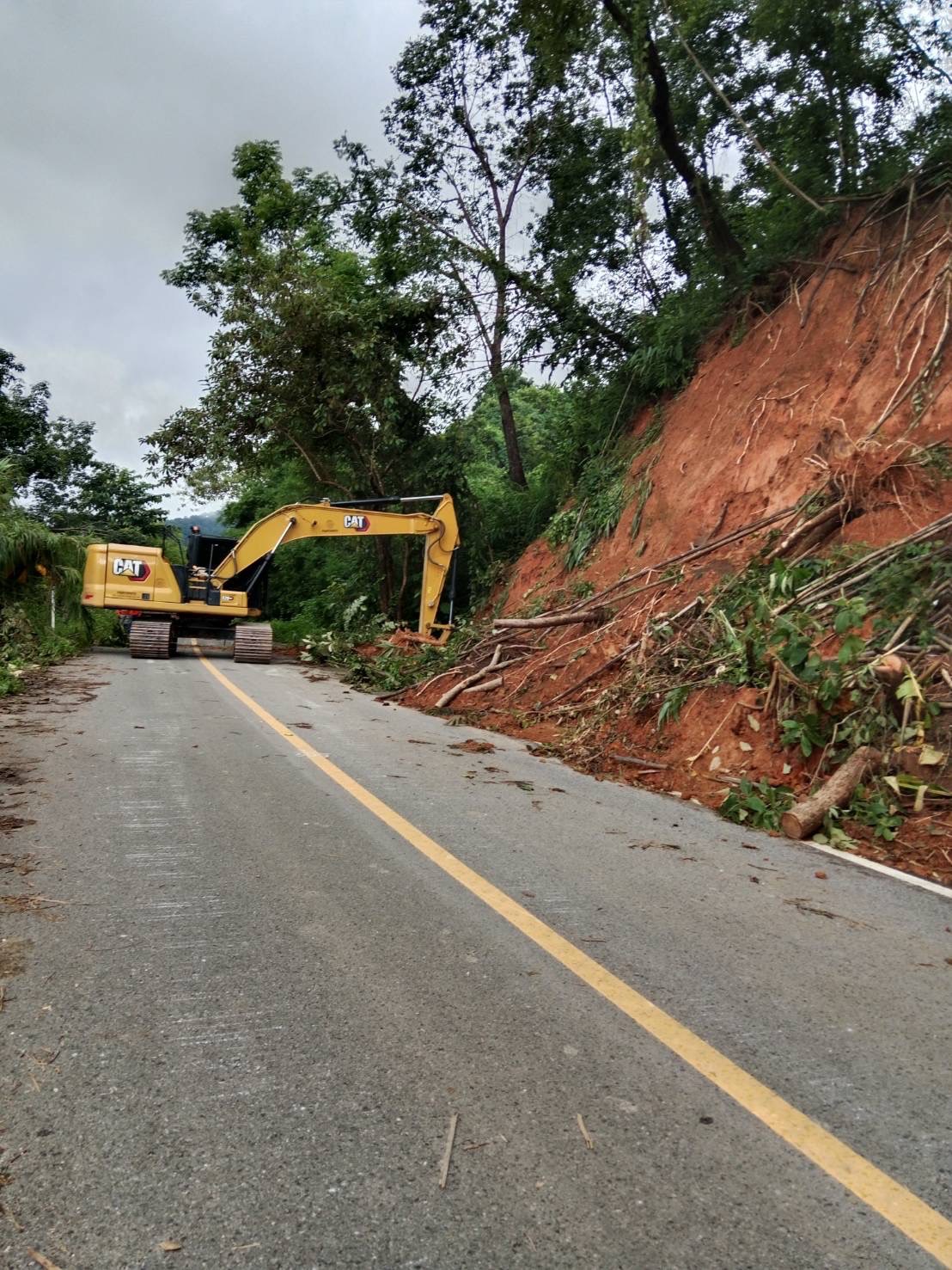 2. ทางหลวงหมายเลข 1093 ขุนห้วยไคร้ – ผาตั้ง ช่วง กม.ที่ 56+040 – 56+230 ในพื้นที่อำเภอเวียงแก่น จังหวัดเชียงราย เกิดเหตุดินสไลด์ ปัจจุบันเจ้าหน้าที่พร้อมเครื่องจักรกำลังเคลียร์พื้นที่