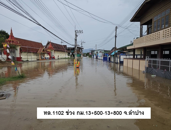 1. ทางหลวงหมายเลข 1102 พระบาท - บ้านเหล่า ช่วง กม.ที่ 13+500 – 13+800 ในพื้นที่อำเภอแม่พริก จังหวัดลำปาง ระดับน้ำสูง 40 ซม. การจราจรผ่านไม่ได้