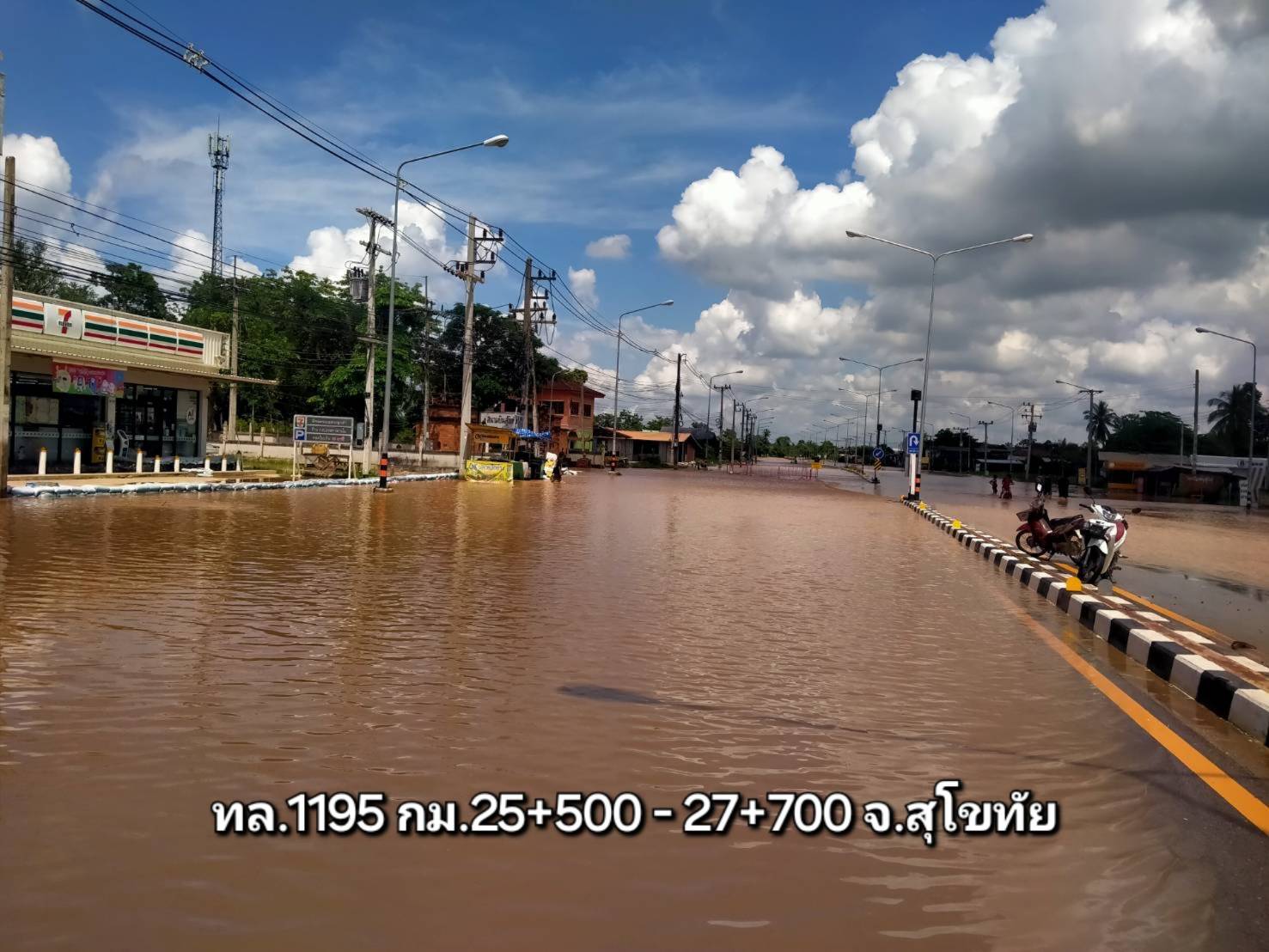3. ทางหลวงหมายเลข 1195 อ.สวรรคโลก สายเตว็ดใน – วังไม้ขอน กม.ที่ 25+500 – 27+700 ระดับน้ำ 30 ซม. การจราจรผ่านไม่ได้ ไม่มีเส้นทางเลี่ยง