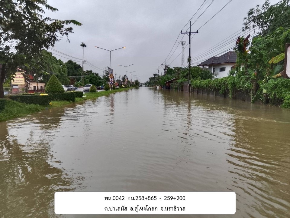 - ทล.42 จุดผ่านแดนถาวรสุไหงโก-ลก (เขตแดนไทย/มาเลเซีย) ช่วง กม.ที่ 258+865 - 259+200 อ.สุไหงโก-ลก ระดับน้ำ 35 ซม.