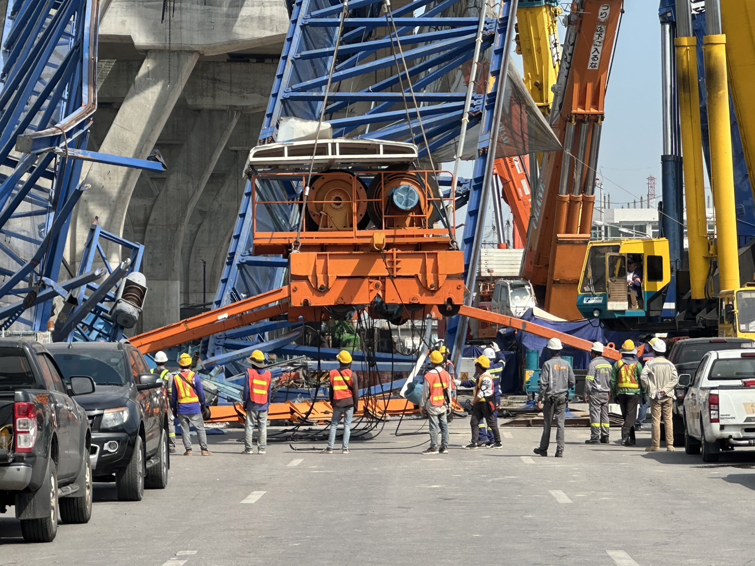 เมื่อวานนี้ (6 ธันวาคม 2567) ทีมวิศวกรได้ดำเนินการตัดชุด Winch ที่ติดกับโครงสร้างเหล็ก เสร็จสิ้นเป็นที่เรียบร้อย โดยดำเนินการตามขั้นตอนอย่างเคร่งครัด ได้แก่ ตัดย่อยอุปกรณ์ที่เกี่ยวข้องกับ Winch เช่น บันไดขึ้น-ลง, สลิง, แกะตู้ Control ออกจาก Winch ลงด้านล่าง, ตัดตะแกรงกันตกชิ้นแรก, ยกชุดรอก Winch ลงมาจากโครงเหล็ก, นำโครงเหล็กชุด Winch ออกจากพื้นที่ และตัดลวดสลิงที่กีดขวางโครงสร้างเหล็ก Truss ออก เพื่อเตรียมความพร้อมสำหรับการรื้อถอนโครงสร้างเหล็ก Truss ที่ได้รับความเสียหายในวันนี้ (7 ธันวาคม 2567) โดยเริ่มจากด้านหลังและยกลงมาด้านล่างล่าสุดเมื่อเวลา 10.00 น. ดร.อรรถสิทธิ์ ศิริสนธิ ที่ปรึกษาคณะอนุกรรมการสาขาวิศวกรรมโครงสร้างและสะพาน วิศวกรรมสถานแห่งประเทศไทย ในพระบรมราชูปถัมภ์ (วสท.) พร้อมด้วยทีมวิศวกรผู้เชี่ยวชาญ ได้ลงพื้นที่ตรวจสอบความพร้อมก่อนการรื้อย้าย Launching Gantry (LG) โดยมีการดำเนินการ ดังนี้