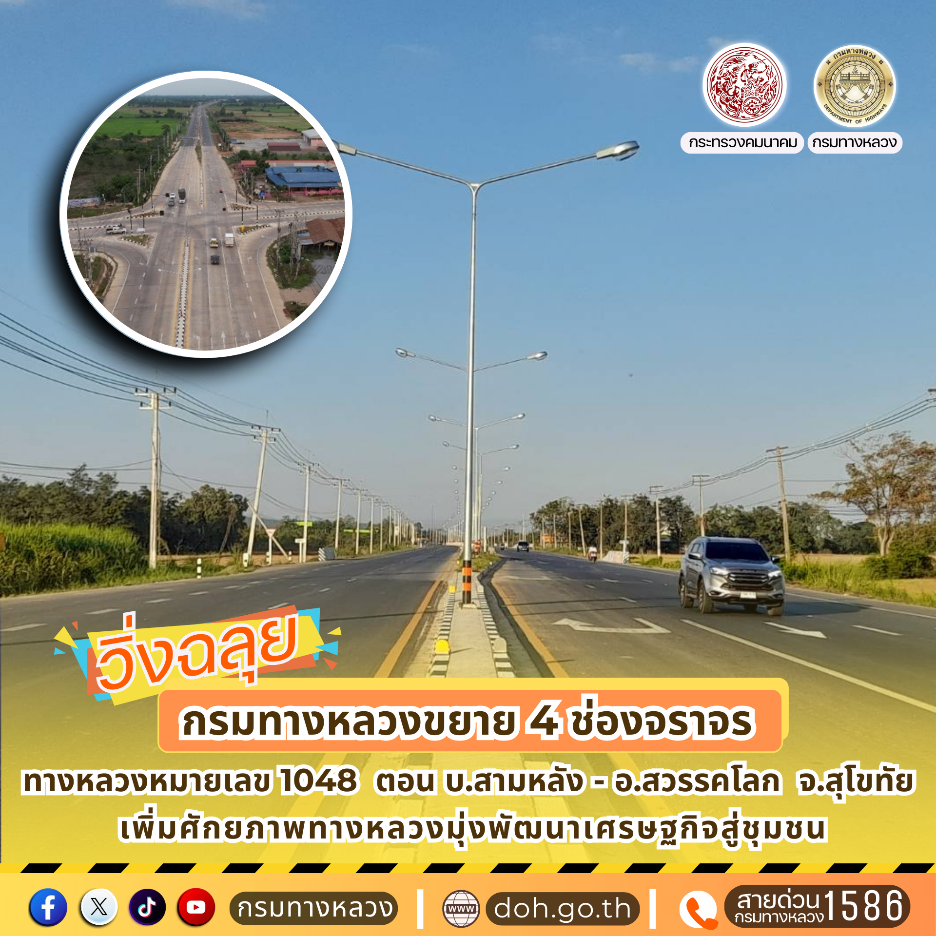 กรมทางหลวง โดยสำนักก่อสร้างทางที่ 1 ดำเนินการก่อสร้างขยายทางหลวงหมายเลข 1048 สาย บ.สามหลัง - อ.สวรรคโลก จ.สุโขทัย ระหว่าง กม. 71+600 - กม. 89+580 ระยะทางประมาณ 17.98 กิโลเมตร เส้นทางสายนี้อยู่ในท้องที่ อ.ทุ่งเสลี่ยม และ อ.สวรรคโลก จ.สุโขทัย พื้นที่ทั่วไปมีลักษณะเป็นพื้นที่ราบลุ่ม สองข้างทางเป็นบ้านพักอาศัยของประชาชน และพื้นที่ทางการเกษตร มีต้นไม้ตลอดสายทาง ซึ่งเป็นเส้นทางส่วนหนึ่งของทางหลวงหมายเลข 1048 สาย ดอนไชย - สวรรคโลก เชื่อมต่อการจราจรระหว่าง อำเภอเถิน จังหวัดลำปาง ถึงอำเภอสวรรคโลก จังหวัดสุโขทัย ระยะทางประมาณ 92.31 กิโลเมตร โดยเส้นทางสายนี้มีลักษณะคดเคี้ยวตามไหล่เขาโดยเฉพาะในช่วงพื้นที่อำเภอเถินมีลักษณะสูงชันมาก กรมทางหลวงจึงได้ทำการก่อสร้างขยายทางหลวงจากขนาด 2 ช่องจราจร เป็นมาตรฐานทางชั้นพิเศษขนาด 4 ช่องจราจร (ไป - กลับ ข้างละ 2 ช่องจราจร) ช่องจราจรกว้างช่องละ 3.50 เมตร ผิวจราจรเป็นผิวแอสฟัลต์ แบ่งทิศทางการจราจรด้วยเกาะกลางแบบกำแพงกั้น และเกาะกลางแบบยกขอบหรือแบบถมดิน รวมงานติดตั้งไฟฟ้าแสงสว่าง ไฟสัญญาณจราจร และไฟกระพริบบนทางหลวง วงเงินงบประมาณ 698,200,000 บาท