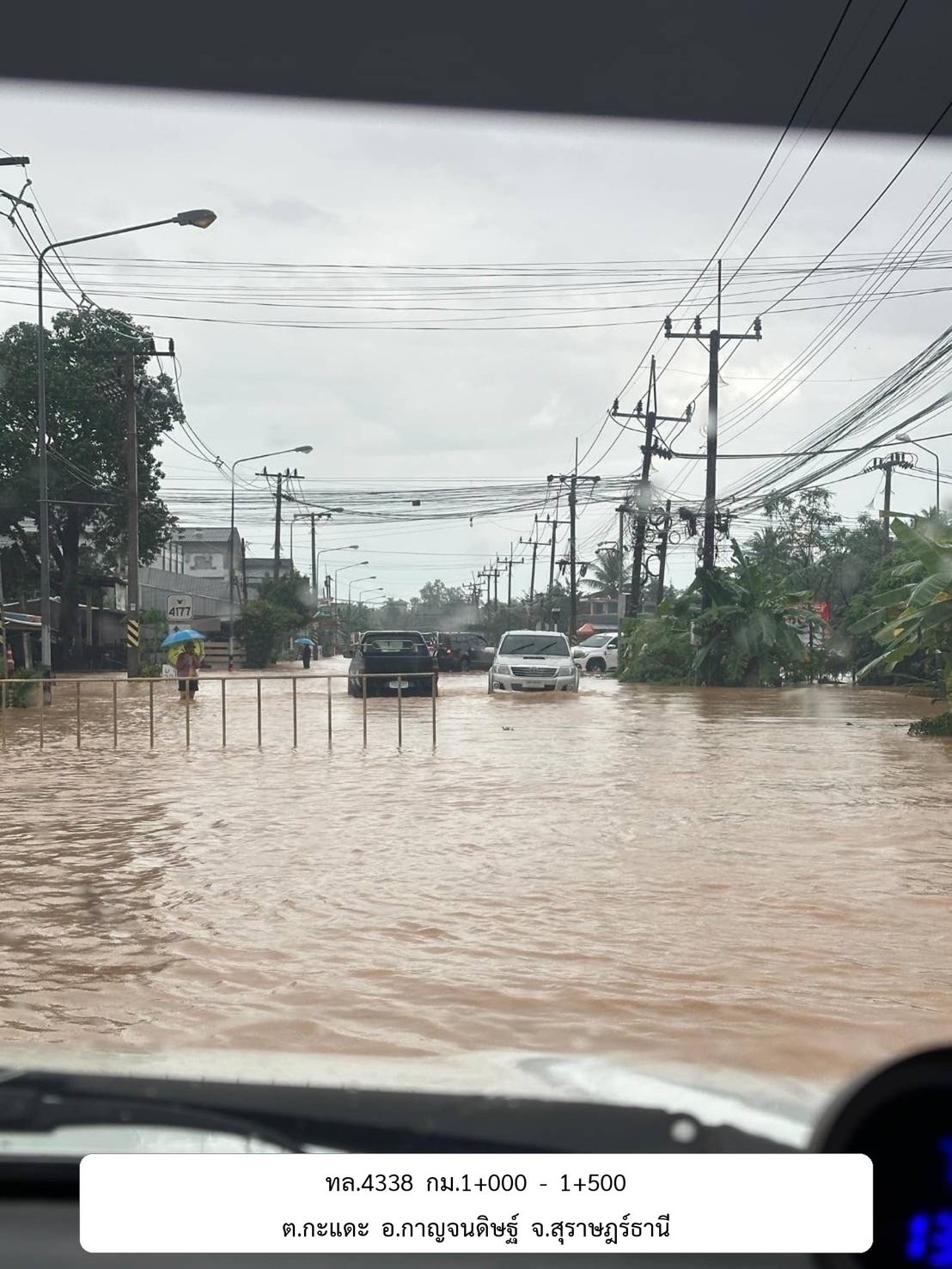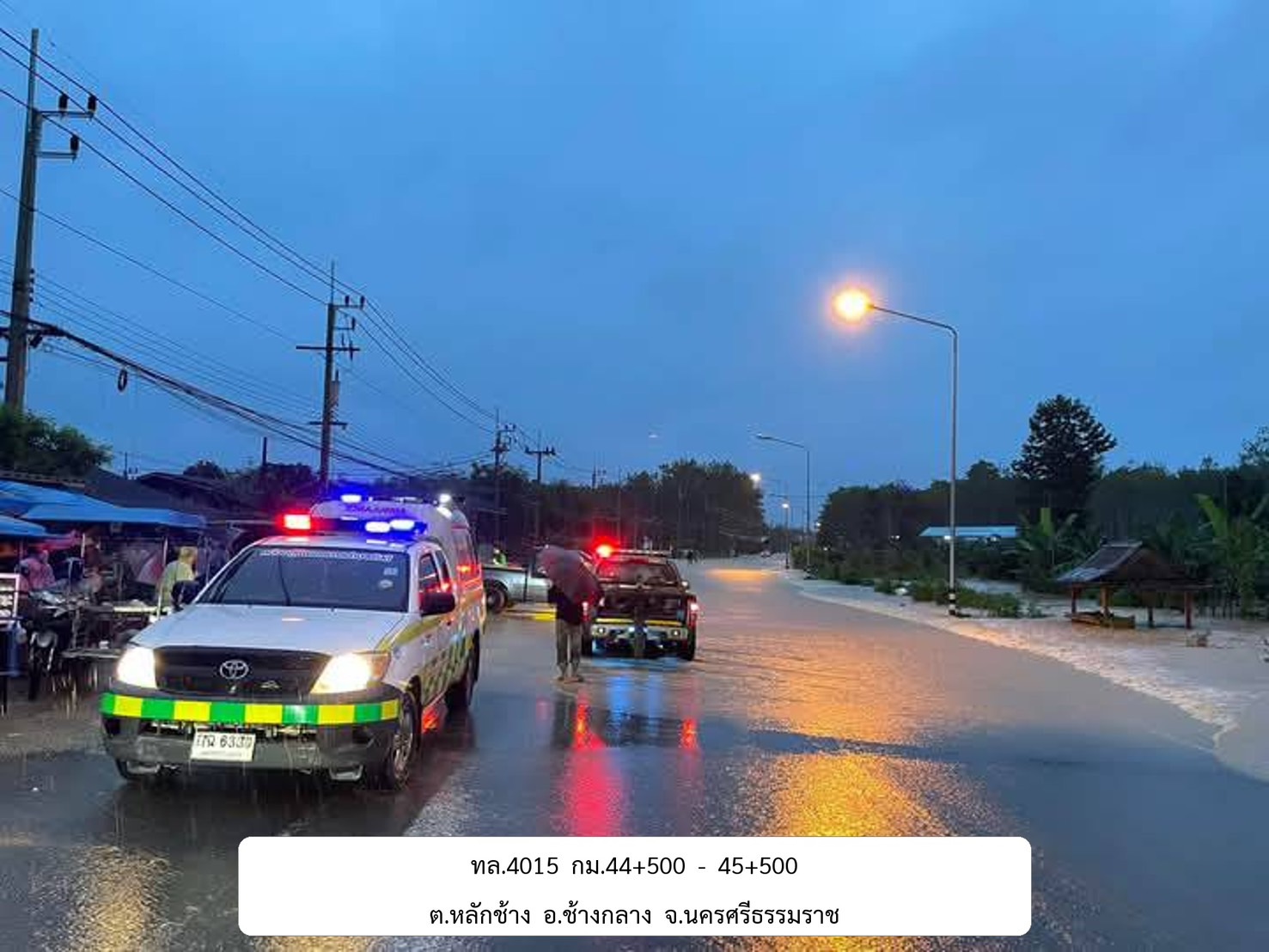 1. ทล.403 สายนครศรีธรรมราช - เสาธง ช่วง กม.ที่ 10+600 - 11+200 อ.พระพรหม ระดับน้ำสูง 100 ซม.