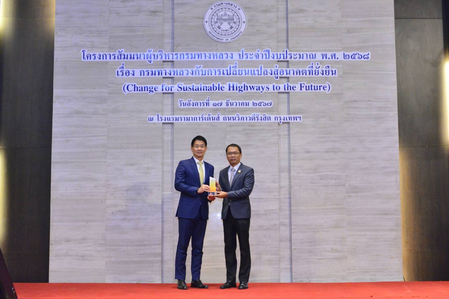 นายอภิรัฐ ไชยวงศ์น้อย อธิบดีกรมทางหลวง ได้กล่าวหลังเปิดโครงการสัมมนาผู้บริหารกรมทางหลวง ประจำปีงบประมาณ พ.ศ. 2568 เรื่อง กรมทางหลวงกับการเปลี่ยนแปลงสู่อนาคตที่ยั่งยืน (Change for Sustainable Highways to the Future) ว่า การสัมมนาในครั้งนี้เป็นการสร้างความเข้าใจเกี่ยวกับนโยบายและ แนวทางการปฏิบัติราชการของกรมทางหลวงประจำปีงบประมาณ พ.ศ. 2568 โดยมีวัตถุประสงค์เพื่อให้ผู้บริหารได้รับทราบนโยบาย ในการขับเคลื่อนนโยบายและเป้าหมายการบริหารงานของกรมทางหลวงในทุกมิติ ด้วยแนวทางปฏิบัติงานเชิงรุกในยุคดิจิทัลได้อย่างมีประสิทธิภาพและเกิดประโยชน์สูงสุด ตอบสนองนโยบายการบริหารราชการแผ่นดินของรัฐบาลได้อย่างมีผลสัมฤทธิ์และเป็นรูปธรรม รวมถึงการได้เพิ่มพูนความรู้ในเรื่องความก้าวหน้าของเทคโนโลยีปัญญาประดิษฐ์ (AI) ในการนําไปใช้ประโยชน์ เพื่อยกระดับขีดความสามารถ สร้างการเปลี่ยนแปลงผลลัพธ์ให้กับองค์กรและความรู้เกี่ยวกับกลยุทธ์เชิงรุกเพื่อพัฒนาภาพลักษณ์องค์กรในยุคดิจิทัล