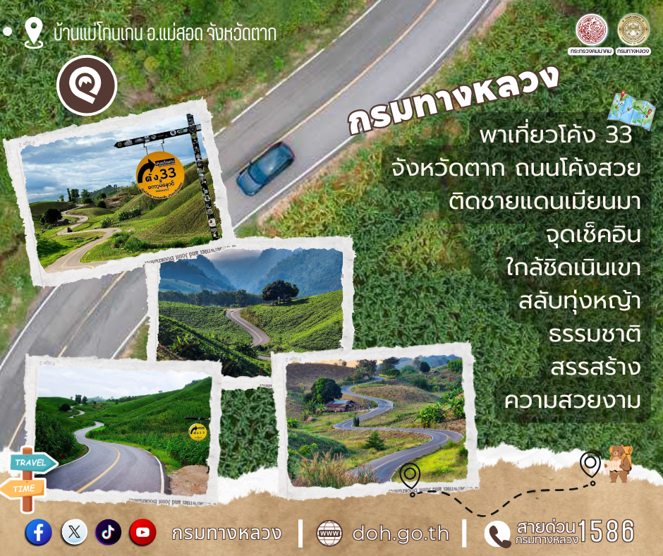 กรมทางหลวง (ทล.) ขอเชิญชวนประชาชนสัมผัสกับเส้นทางสายธรรมชาติ “ถนนโค้ง 33” บ้านแม่โกนเกน  อำเภอแม่สอด จังหวัดตาก ชมถนนวิวสวยในไทยเหมือนอยู่ต่างประเทศ ธรรมชาติสองข้างทางแบบ 360 องศา  จุดเช็คอินให้ถ่ายภาพกับธรรมชาติ และถนนที่สวยงามเป็นจุดหมายหนึ่งที่นักท่องเที่ยวที่รักการเดินทางมักจะปักหมุดเป็นจุดหมายในการพักผ่อนในช่วงวันหยุดยาว หรือผู้ที่ต้องการเติมพลังในการทำงานหลังจากที่ผ่านช่วงเวลาที่เหน็ดเหนื่อย จังหวัดตากเป็นอีกแลนด์มาร์กหนึ่งที่นักท่องเที่ยวนิยมเดินทางไปท่องเที่ยวกับธรรมชาติเป็นจำนวนมาก เนื่องจากเป็นจังหวัดที่อยู่ใกล้ชิดกับธรรมชาติ มีเนินเขา ทุ่งหญ้า ถ้ำและธารน้ำตก ที่รอคอยให้นักท่องเที่ยว   ไปเยี่ยมชมธรรมชาติที่สร้างสรรค์ความมหัศจรรย์ให้กับพื้นที่จังหวัดตากเป็นจำนวนมาก
