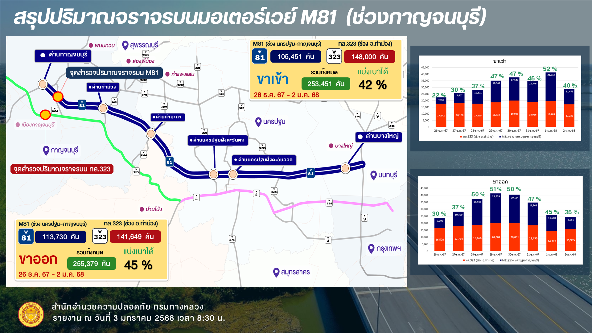 3 มกราคม 2568 – นายอภิรัฐ ไชยวงศ์น้อย อธิบดีกรมทางหลวง เปิดเผยว่า การเปิดทดลองให้บริการทางหลวงพิเศษระหว่างเมืองหมายเลข 81 สายบางใหญ่ – กาญจนบุรี หรือมอเตอร์เวย์ M81 ได้รับการตอบรับอย่างดีเยี่ยมจากประชาชน โดยในช่วงเปิดให้ทดลองใช้ฟรีตลอดเทศกาลปีใหม่ 2568 (26 ธ.ค. 67 - 2 ม.ค. 68) มีปริมาณรถยนต์ใช้เส้นทาง M81 ช่วงบางใหญ่ - นครปฐม รวมทั้งสิ้น 276,316 คัน สามารถแบ่งเบาปริมาณจราจรบนทางหลวงหมายเลข 4 (ถนนเพชรเกษม) ช่วง อ.นครชัยศรี จ.นครปฐม ได้ 23% ส่วนเส้นทาง M81 ช่วงนครปฐม - กาญจนบุรี มีปริมาณรถยนต์ใช้เส้นทาง รวมทั้งสิ้น 219,181 คัน สามารถแบ่งเบาปริมาณจราจรบนทางหลวงหมายเลข 323 ช่วง อ.ท่าม่วง จ.กาญจนบุรี ได้ถึง 43% สะท้อนให้เห็นถึงประโยชน์ของโครงการ M81 ในการอำนวยความสะดวก ร่นระยะเวลาเดินทาง และช่วยระบายการจราจรบนเส้นทางหลักจากกรุงเทพฯ และปริมณฑล สู่ภาคตะวันตกและภาคใต้ ผ่านจังหวัดนครปฐม และจังหวัดกาญจนบุรี ซึ่งเป็นเมืองท่องเที่ยวสำคัญ ไปสู่จังหวัดต่าง ๆ เช่น ราชบุรี เพชรบุรี ประจวบคีรีขันธ์ ได้อย่างรวดเร็ว