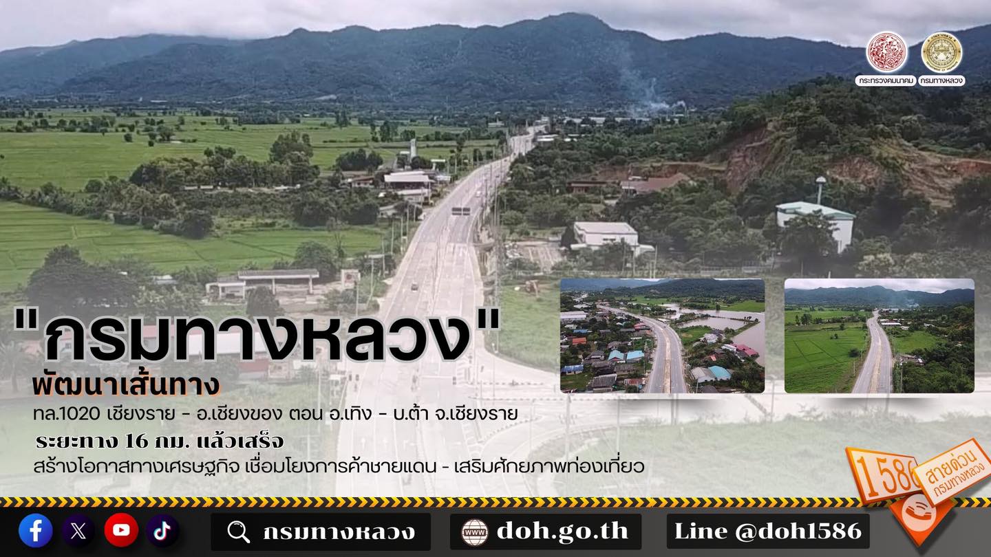 นายอภิรัฐ ไชยวงศ์น้อย อธิบดีกรมทางหลวง (ทล.) เปิดเผยว่า กรมทางหลวงมุ่งมั่นพัฒนาโครงสร้างพื้นฐานด้านคมนาคมขนส่งอย่างต่อเนื่อง เพื่อยกระดับคุณภาพชีวิตของประชาชน และสร้างความเจริญก้าวหน้าให้กับประเทศ โดยล่าสุด สำนักก่อสร้างทางที่ 1 ได้ดำเนินการพัฒนาเส้นทางหลวงหมายเลข 1020 สายเชียงราย - อ.เชียงของ ตอน อ.เทิง - บ.ต้า พื้นที่ จ.เชียงราย ระหว่าง กม.64+500 - กม.80+500 ระยะทาง 16 กม. แล้วเสร็จ เพื่อรองรับการขยายตัวทางเศรษฐกิจ การค้า และการท่องเที่ยว