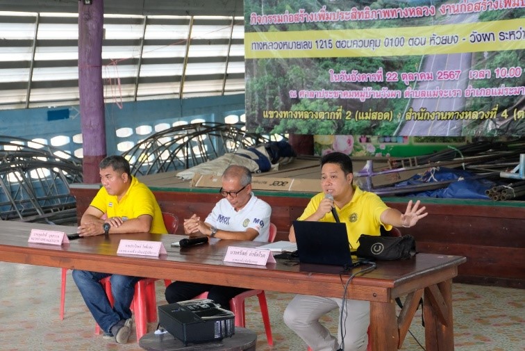1.1 เพื่อเผยแพร่ประชาสัมพันธ์ข้อมูลข่าวสาร "โครงการก่อสร้างโครงข่ายทางหลวงแผ่นดิน กิจกรรมก่อสร้างเพิ่มประสิทธิภาพทางหลวง งานก่อสร้างเพิ่มประสิทธิภาพทางหลวง" ทางหลวงหมายเลข 1215 ให้ประชาชนและผู้มีส่วนได้ส่วนเสียที่อาศัยอยู่สองข้างทางในบริเวณพื้นที่โครงการ