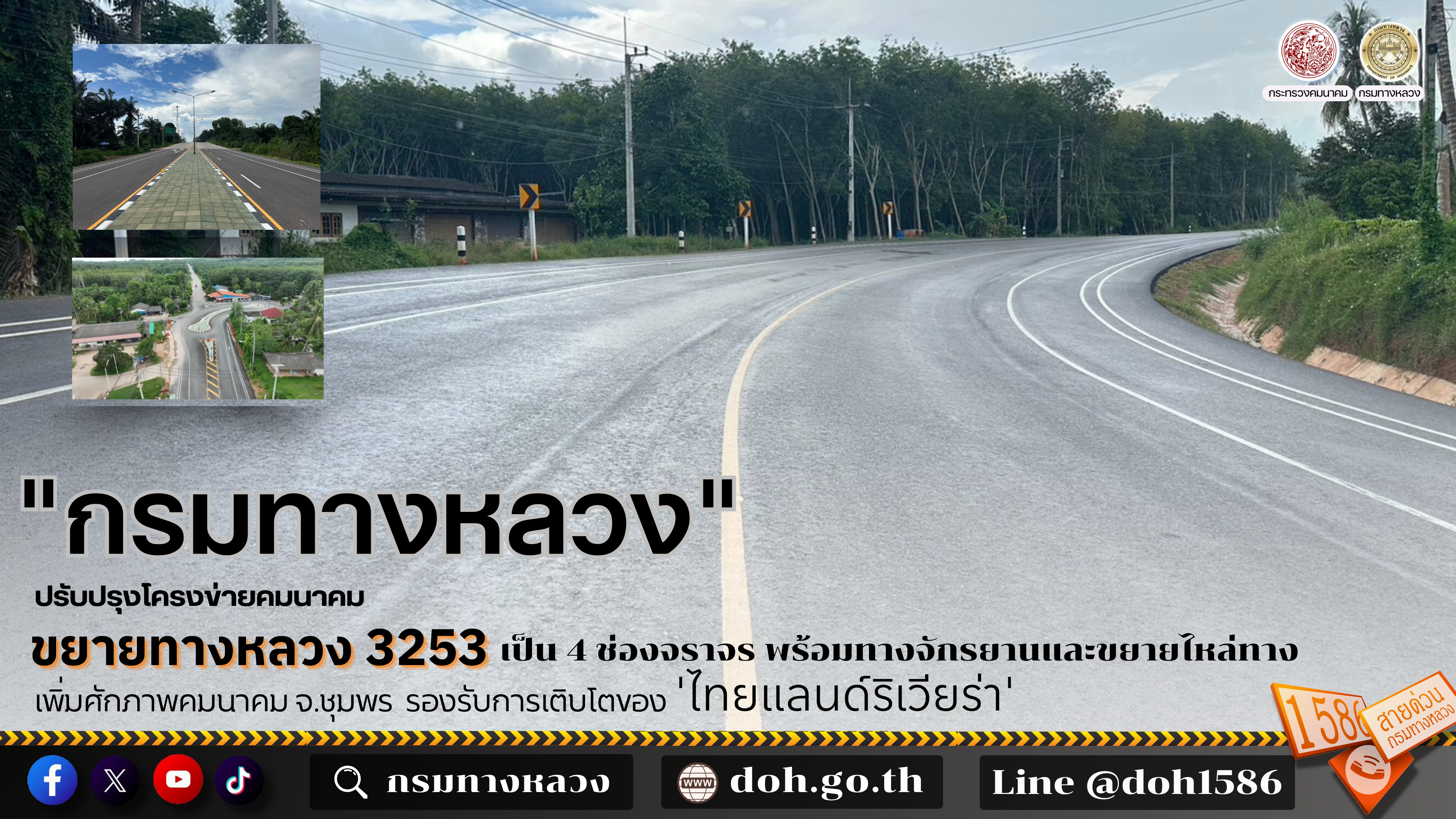 กรมทางหลวง โดยสำนักก่อสร้างทางที่ 1 ประสบความสำเร็จในการก่อสร้างขยายทางหลวงหมายเลข 3253 สายบ้านปากคลอง - บ้านบางจาก จังหวัดชุมพร ช่วงกิโลเมตรที่ 22+530 ถึง 34+243 ระยะทางรวม 11.71 กิโลเมตรแล้วเสร็จ พร้อมเปิดให้ประชาชนใช้สัญจรอย่างเป็นทางการ เพื่อรองรับการท่องเที่ยวตามโครงการพัฒนาพื้นที่ชายฝั่งทะเลด้านตะวันตกของอ่าวไทย (Thailand Riviera) และส่งเสริมการเติบโตทางเศรษฐกิจของจังหวัดชุมพร