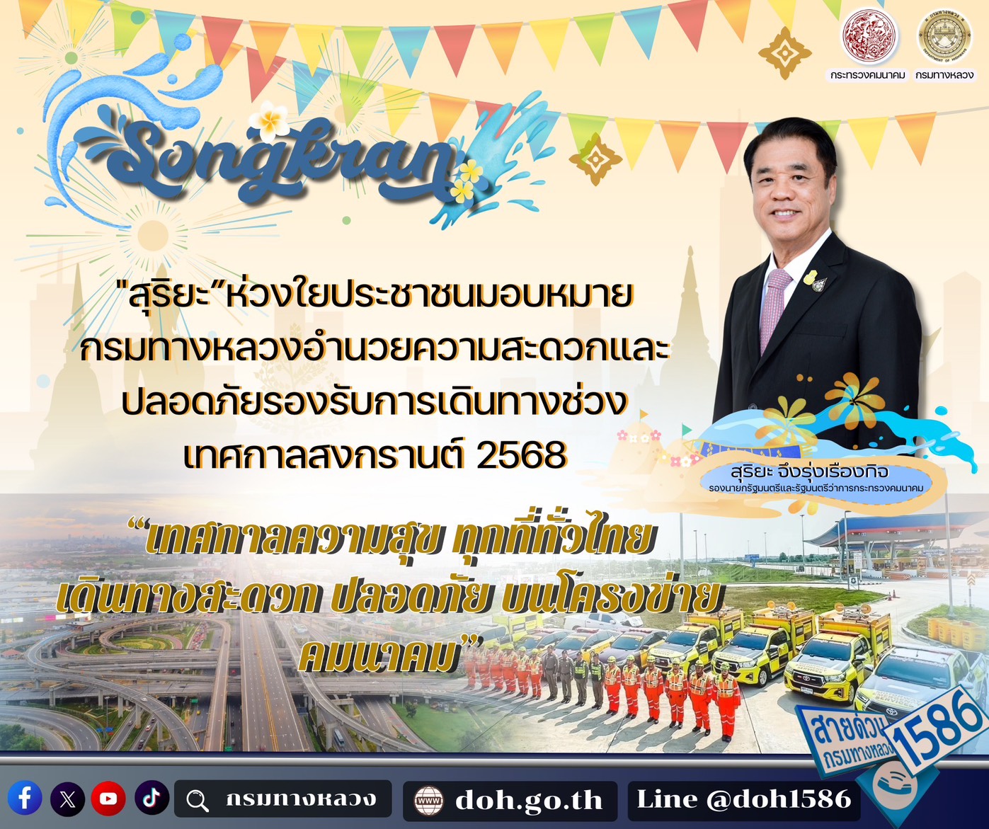นายสุริยะ จึงรุ่งเรืองกิจ รองนายกรัฐมนตรี และรัฐมนตรีว่าการกระทรวงคมนาคม กล่าวว่า ช่วงเทศกาลสงกรานต์ 2568 ที่จะถึงนี้ คาดว่าจะมีประชาชนเดินทางกลับภูมิลำเนาและท่องเที่ยวเป็นจำนวนมาก ตนมีความห่วงใยพี่น้องประชาชนในการเดินทางช่วงดังกล่าว จึงได้มอบหมายให้กรมทางหลวง (ทล.) เตรียมความพร้อมในการอำนวยความสะดวกและปลอดภัย ระหว่างวันที่ 11 - 17 เมษายน 2568 ตามนโยบายของกระทรวงคมนาคม เพื่อรองรับการเดินทางของประชาชนสู่ภูมิภาคต่าง ๆ ภายใต้หัวข้อรณรงค์ “เทศกาลความสุข ทุกที่ ทั่วไทย เดินทางสะดวก ปลอดภัย บนโครงข่ายคมนาคม”