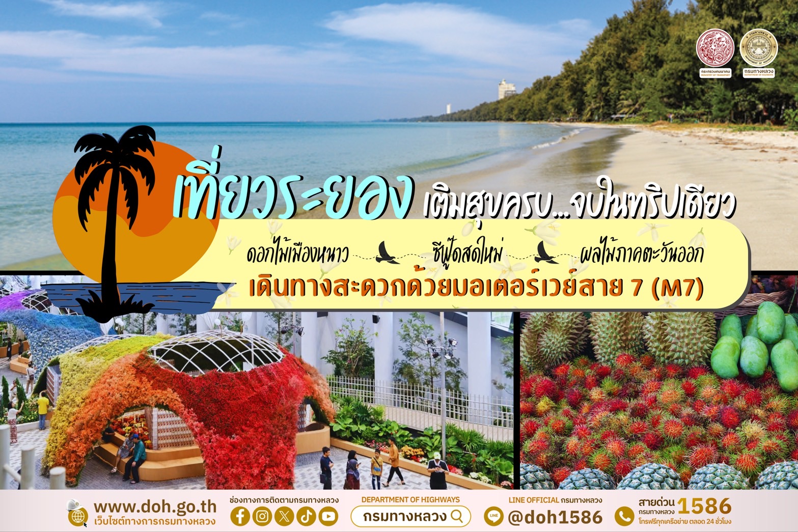 กรมทางหลวง ยังคงมุ่งมั่นพัฒนาโครงข่ายทางหลวงเพื่อเชื่อมโยงเมืองและชุมชน พร้อมสนับสนุนการท่องเที่ยวในประเทศไทยเพื่อสร้างคุณค่าให้แก่ชุมชน ยกระดับคุณภาพชีวิต และเศรษฐกิจของประเทศ ทั้งนี้ หากประชาชนต้องการสอบถามเส้นทางการจราจร แจ้งเหตุ หรือต้องการความช่วยเหลือ สามารถติดต่อได้ที่ แขวงทางหลวงระยอง โทร. 03 – 861 – 1590 สายด่วนกรมทางหลวง 1586 และสายด่วนมอเตอร์เวย์ 1586 กด 7 (โทรฟรี 24 ชั่วโมง)