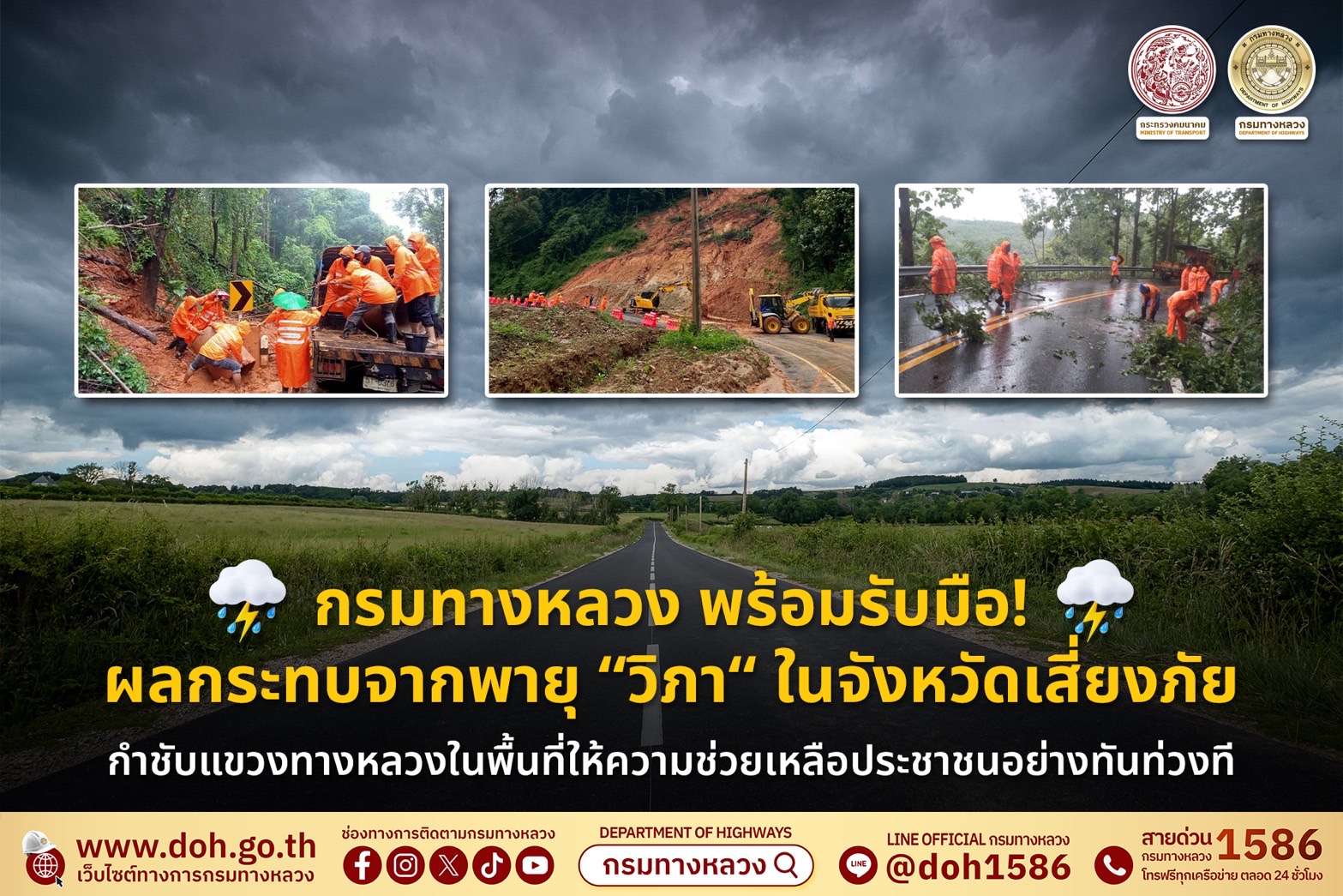 ศูนย์บัญชาการเหตุการณ์ภัยพิบัติกรมทางหลวง ได้ติดตามสถานการณ์พายุวิภาอย่างใกล้ชิด โดยขอความร่วมมือประชาชนผู้ใช้รถใช้ถนนในพื้นที่ภาคเหนือและอีสานตอนบนเพิ่มความระมัดระวังใน การเดินทาง หลีกเลี่ยงเส้นทางที่มีฝนตกหนักและปฏิบัติตามคำแนะนำของเจ้าหน้าที่อย่างเคร่งครัด สามารถสอบถามข้อมูลเส้นทางได้ที่สายด่วนกรมทางหลวง 1586 ตลอด 24 ชั่วโมง