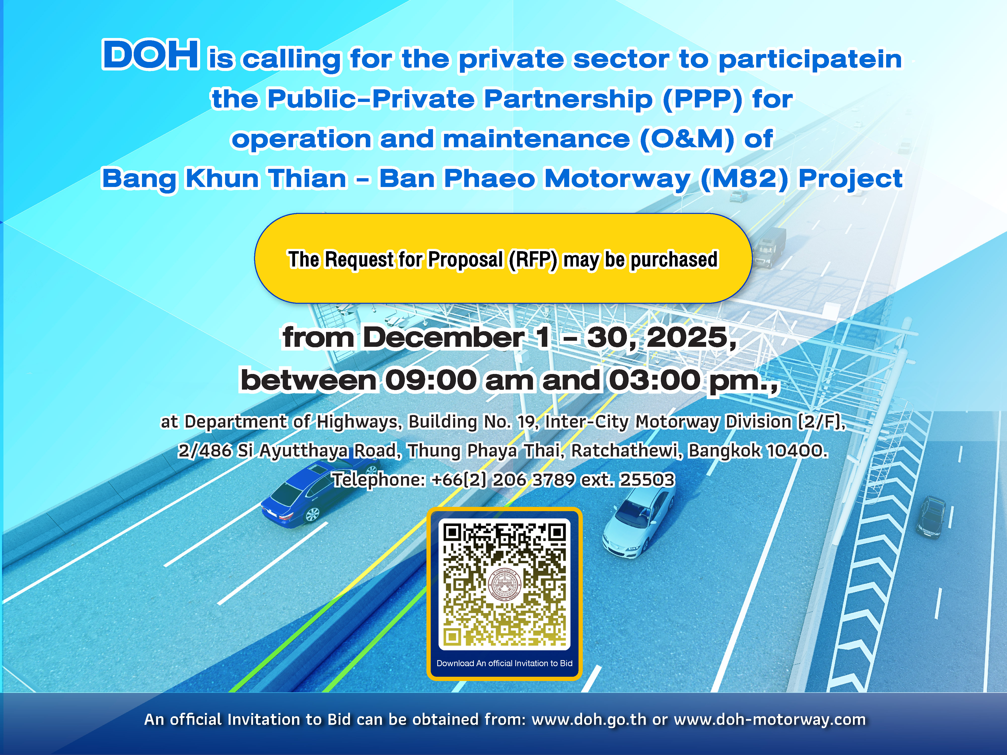 ผู้สนใจสามารถติดต่อขอซื้อเอกสารสำหรับการคัดเลือกเอกชน (Request for Proposal: RFP) ของโครงการฯ ได้ในวันทำการของกรมทางหลวง ตั้งแต่วันที่ 1 ธันวาคม 2568 ถึงวันที่ 30 ธันวาคม 2568ระหว่างเวลา 09.00 น. ถึง 15.00 น. ติดต่อได้ที่ : อาคาร 19 กองทางหลวงพิเศษระหว่างเมือง (ชั้น 2)
