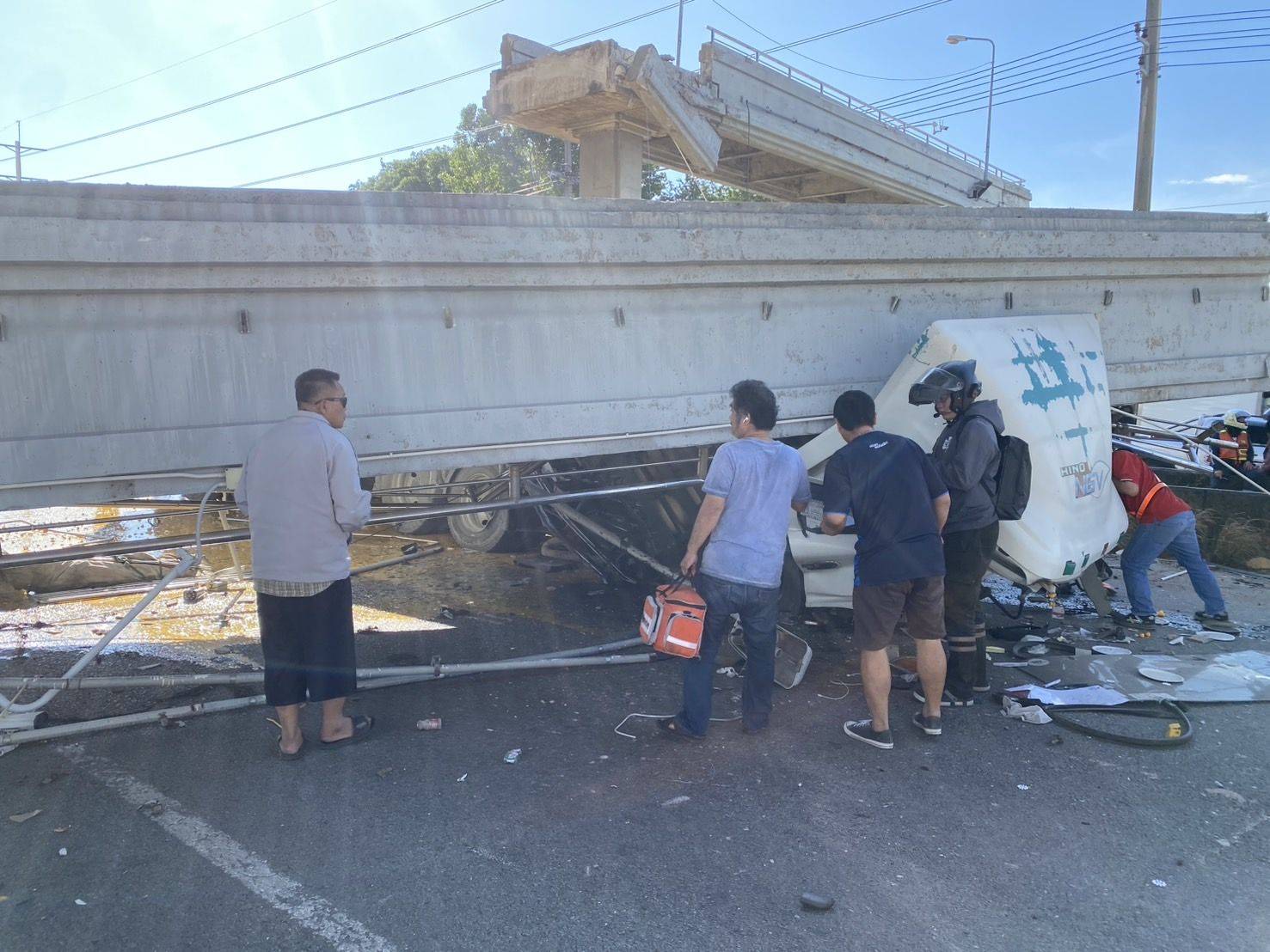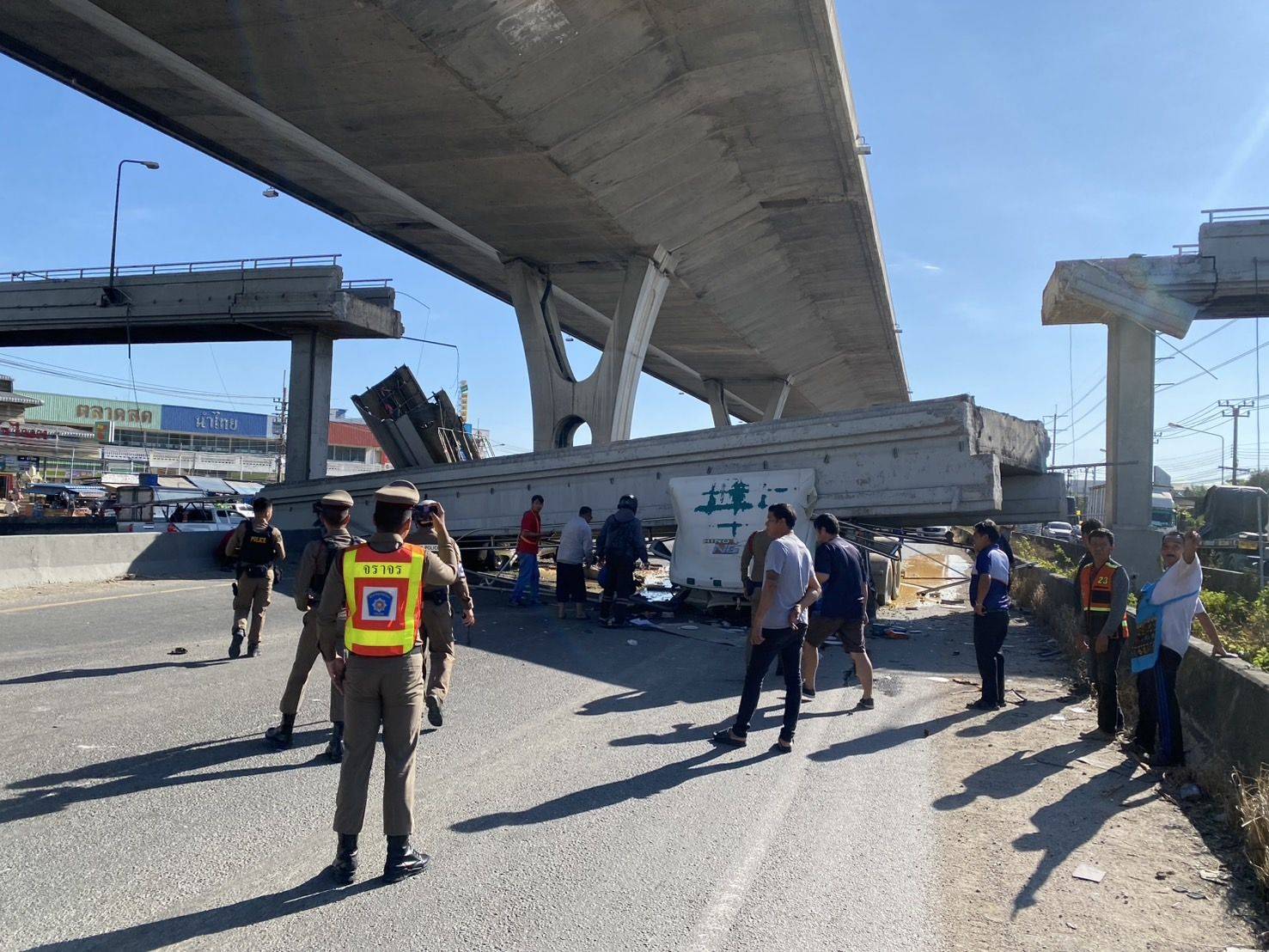 ขณะเกิดเหตุมีผู้พบเห็นเหตุการณ์รายงานว่า เห็นส่วนดัมพ์ของรถบรรทุกอยู่ในลักษณะยกสูงค้างอยู่ ก่อนจะชนคานสะพานลอยและทำให้คานเคลื่อนตัวร่วงลงทับตัวรถบรรทุกและรถข้างเคียง ส่งผลให้คานกีดขวางทุกช่องจราจรบนทางหลักฝั่งขาเข้า