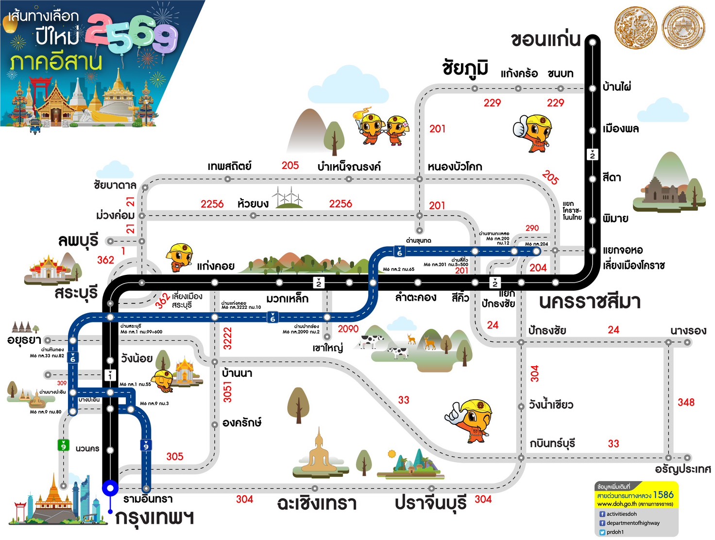 ทั้งนี้ กรมทางหลวงขอความร่วมมือผู้ใช้ทางขับขี่ด้วยความระมัดระวัง ปฏิบัติตามป้ายเตือน ป้ายแนะนำ และคำแนะนำของเจ้าหน้าที่อย่างเคร่งครัด หากประชาชนต้องการสอบถามข้อมูลการเดินทางเพิ่มเติมหรือ แจ้งเหตุด่วนเหตุร้ายระหว่างเดินทาง สามารถติดต่อได้ที่สายด่วนกรมทางหลวง 1586 (โทรฟรีทุกเครือข่ายตลอด 24 ชั่วโมง) สายด่วนมอเตอร์เวย์ 1586 กด 7 และตำรวจทางหลวง 1193