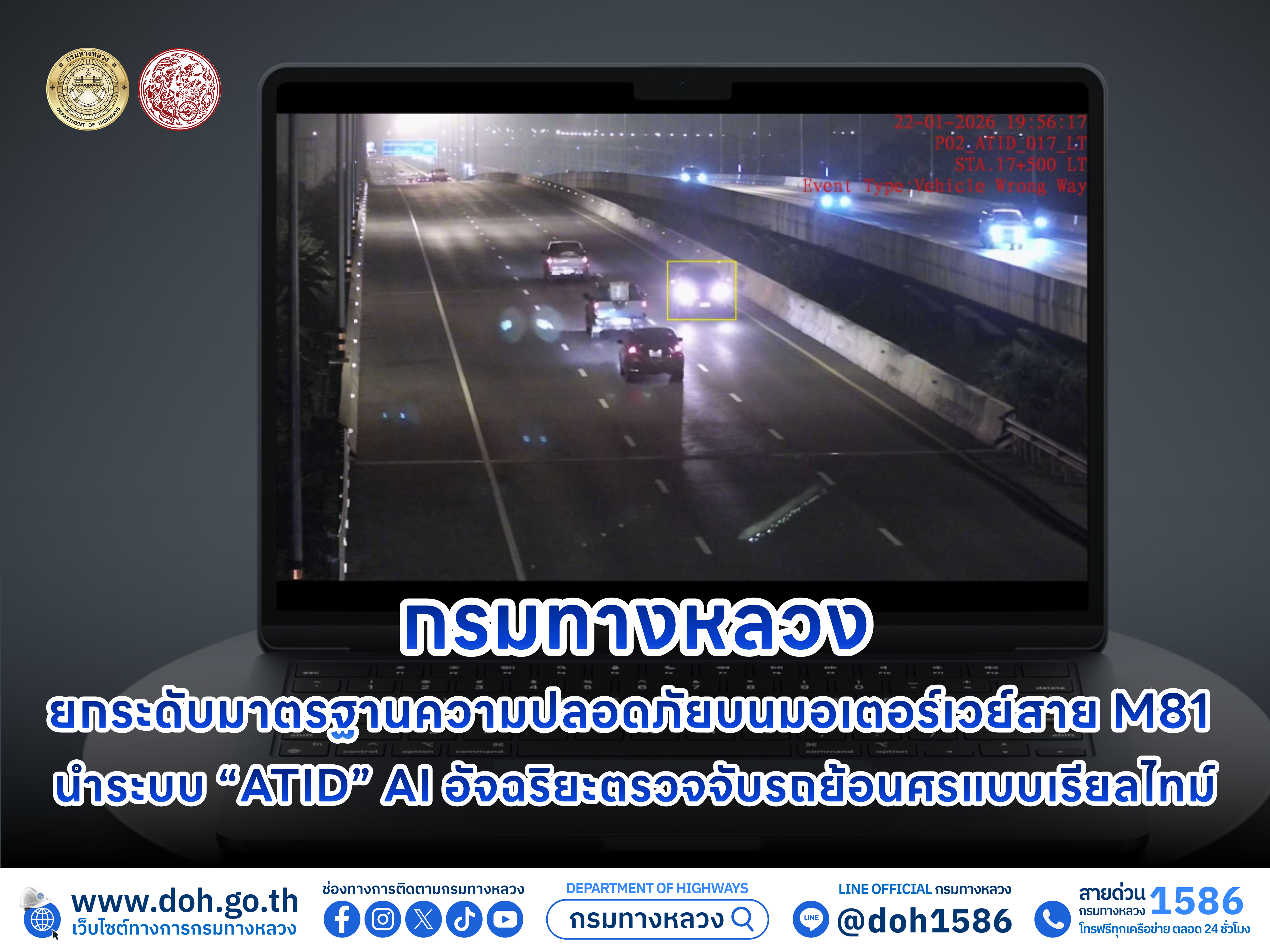 กรมทางหลวง โดยกองทางหลวงพิเศษระหว่างเมือง (Motorway) มุ่งมั่นยกระดับมาตรฐานความปลอดภัยบน ทางหลวงพิเศษระหว่างเมือง (มอเตอร์เวย์)สายบางใหญ่ - กาญจนบุรี (M81) ด้วยการนำเทคโนโลยี AI มาบริหารจัดการจราจรเชิงรุก เพื่อสร้างความเชื่อมั่นและดูแลความปลอดภัยของประชาชนผู้ใช้ทางตลอด 24 ชั่วโมง โดยล่าสุดได้แสดงให้เห็นถึงประสิทธิภาพของระบบอัจฉริยะในการตรวจพบ และระงับเหตุการณ์รถยนต์นั่งส่วนบุคคลที่ขับขี่ย้อนศรได้อย่างรวดเร็วและแม่นยำ