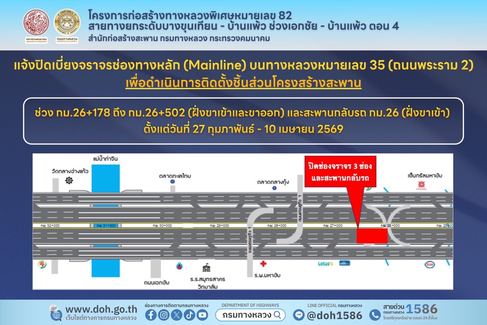 สำนักก่อสร้างสะพาน กรมทางหลวง ขอแจ้งประชาสัมพันธ์การปรับเบี่ยงการจราจรบนทางหลวงหมายเลข 35 (ถนนพระราม 2) บริเวณช่วง กม.26+178 ถึง กม.26+502 และสะพานกลับรถที่ กม.26 ฝั่งขาเข้ากรุงเทพ เพื่อดำเนินการติดตั้งชิ้นส่วนโครงสร้างโครงการทางหลวงพิเศษหมายเลข 82 (M82) สายทางยกระดับบางขุนเทียน – บ้านแพ้ว (ตอน 4) ตามแผนงานก่อสร้าง