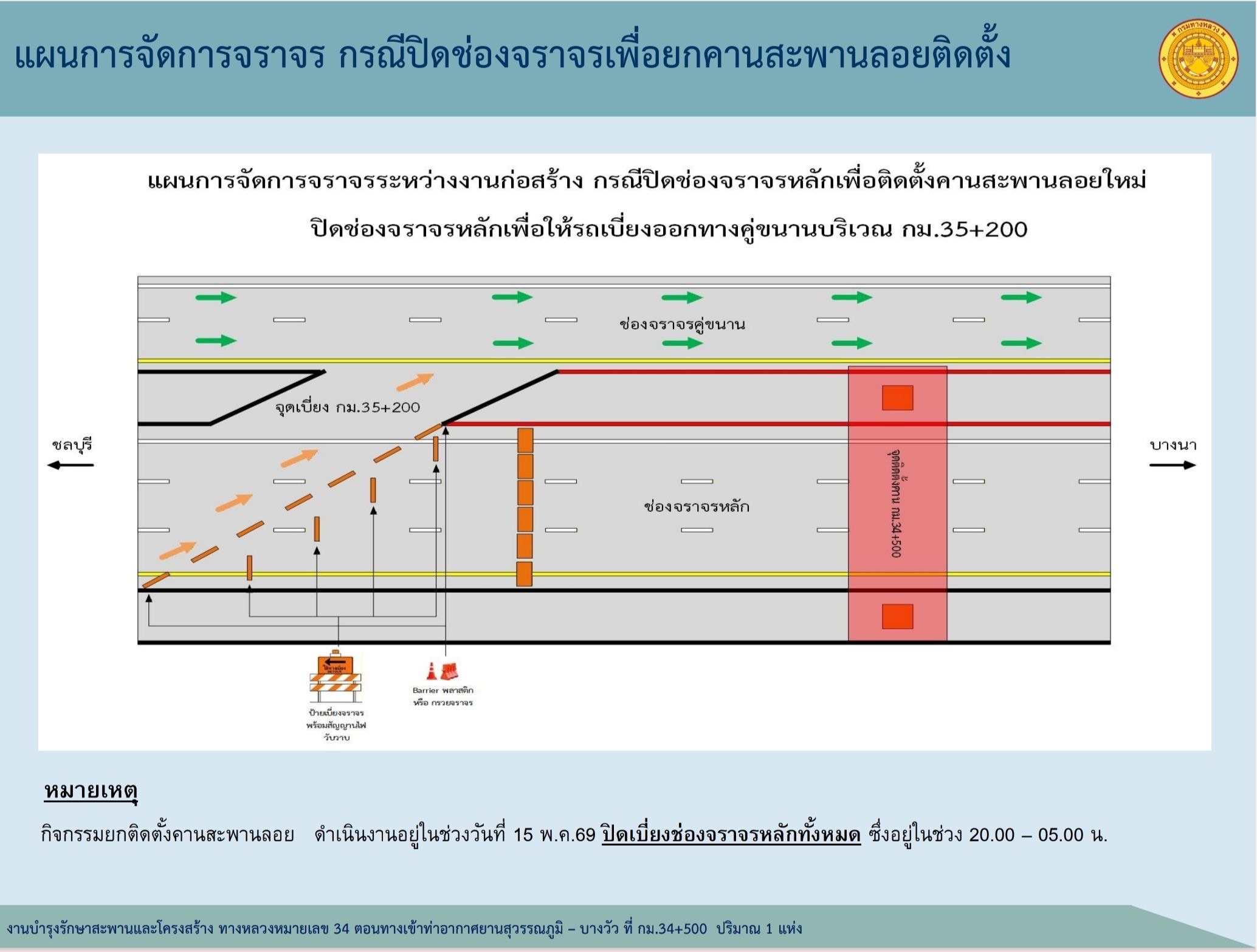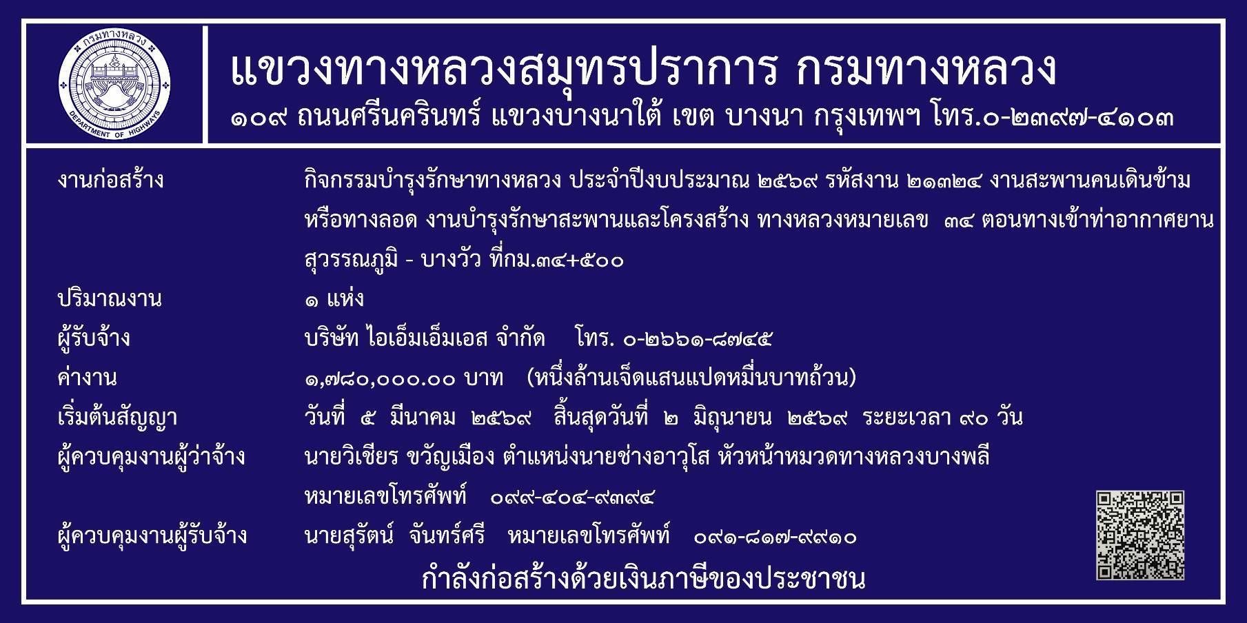 กรมทางหลวง โดยแขวงทางหลวงสมุทรปราการ ได้ดำเนินการจัดทำสัญญาจ้างงานกิจกรรมบำรุงรักษาทางหลวง ประจำปีงบประมาณ 2569 งานสะพานคนเดินข้ามหรือทางลอด และงานบำรุงรักษาสะพานและโครงสร้าง บนทางหลวงหมายเลข 34 ตอนทางเข้าท่าอากาศยานสุวรรณภูมิ – บางวัว บริเวณ กม.34+500 ปริมาณงาน 1 แห่ง เริ่มต้นสัญญาวันที่ 5 มีนาคม 2569 และสิ้นสุดสัญญาวันที่ 2 มิถุนายน 2569 ระยะเวลาดำเนินการ 90 วัน โดยบริษัท ไดเอ็มเอ็มเอส จำกัด เป็นผู้รับจ้าง ซึ่งขณะนี้ผู้รับจ้างมีความพร้อมในการเข้าดำเนินการก่อสร้างตามสัญญาในพื้นที่ดังกล่าว