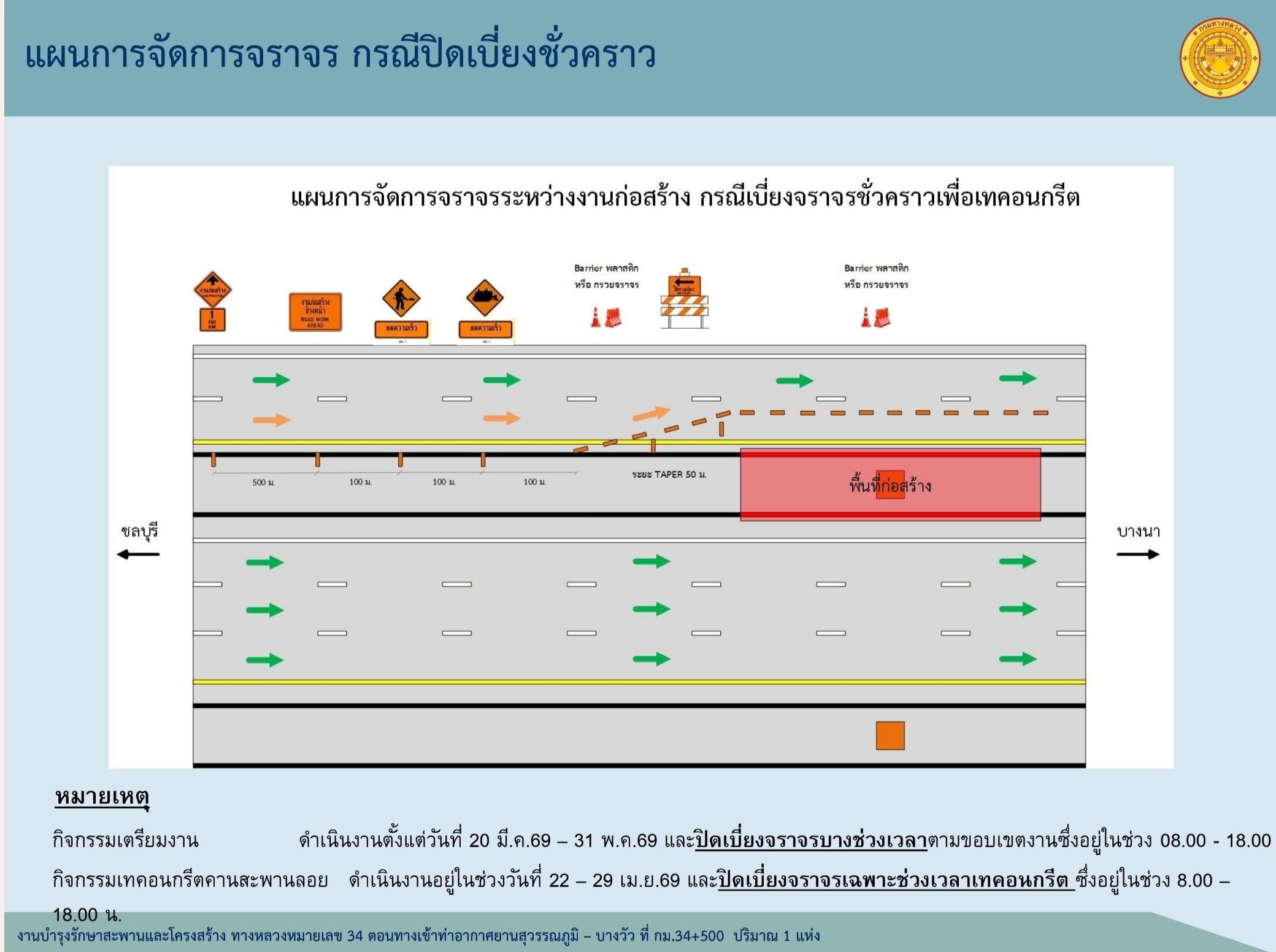 ทั้งนี้ ในระหว่างการดำเนินงาน อาจมีความจำเป็นต้องปิดการจราจรเป็นบางช่วงชั่วคราว ซึ่งอาจส่งผลให้ผู้ใช้เส้นทางไม่ได้รับความสะดวก กรมทางหลวงจึงขออภัยในความไม่สะดวกมา ณ โอกาสนี้ และขอให้ประชาชนวางแผนการเดินทางล่วงหน้า หากไม่จำเป็นโปรดหลีกเลี่ยงการใช้เส้นทางบริเวณดังกล่าว พร้อมทั้งขอความร่วมมือผู้ใช้ทางปฏิบัติตามป้ายแนะนำการจราจร ป้ายเตือน และสัญญาณจราจรที่ติดตั้งไว้อย่างเคร่งครัด เพื่อความปลอดภัยของผู้ใช้ทาง สอบถามรายละเอียดเพิ่มเติมได้ที่ แขวงทางหลวงสมุทรปราการ โทรศัพท์ 02 397 4103, 02 206 3789 กด 1 ต่อ 53613, 53617 (ในวันและเวลาราชการ) หรือที่สายด่วนกรมทางหลวง 1586 (โทรฟรีทุกเครือข่าย)