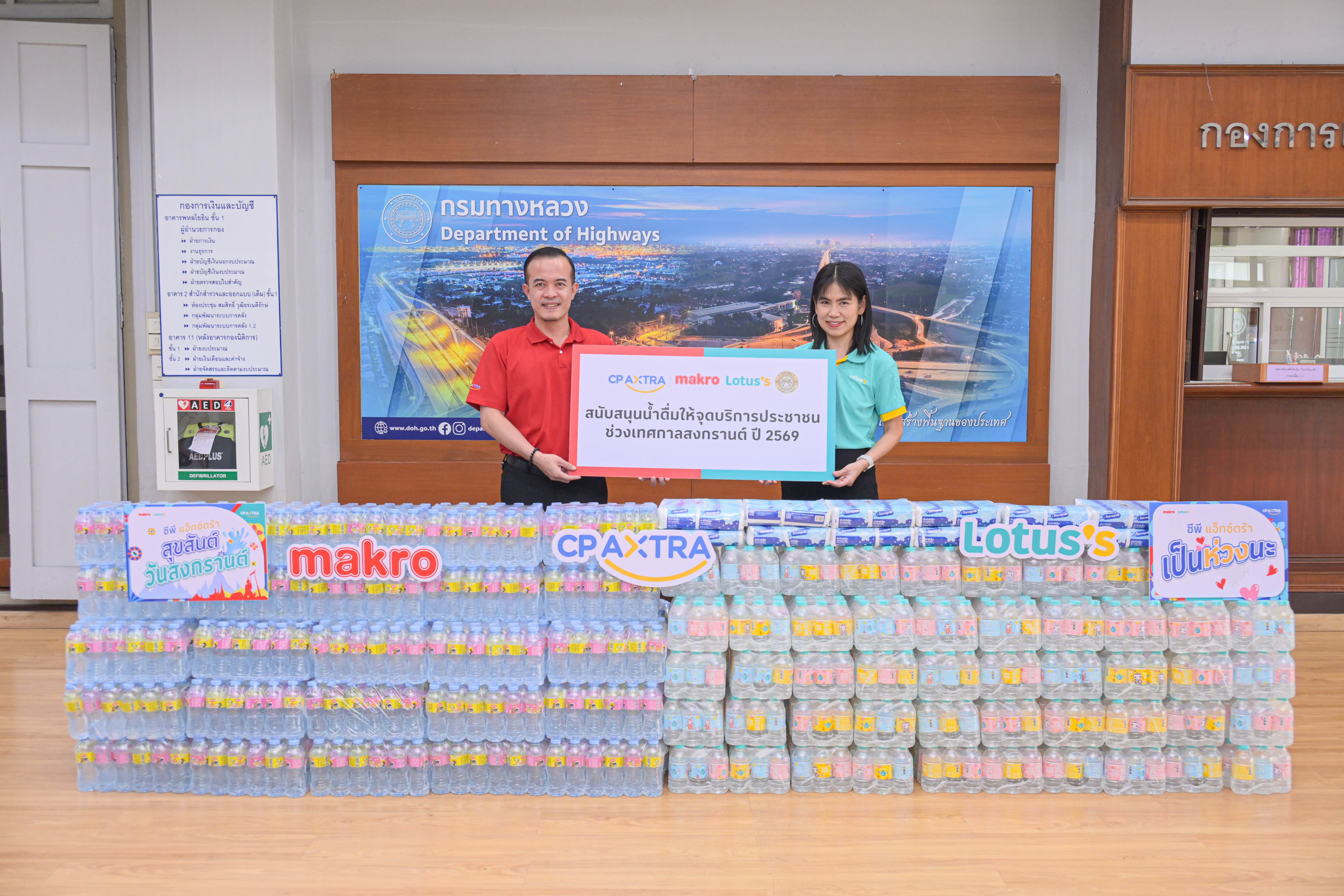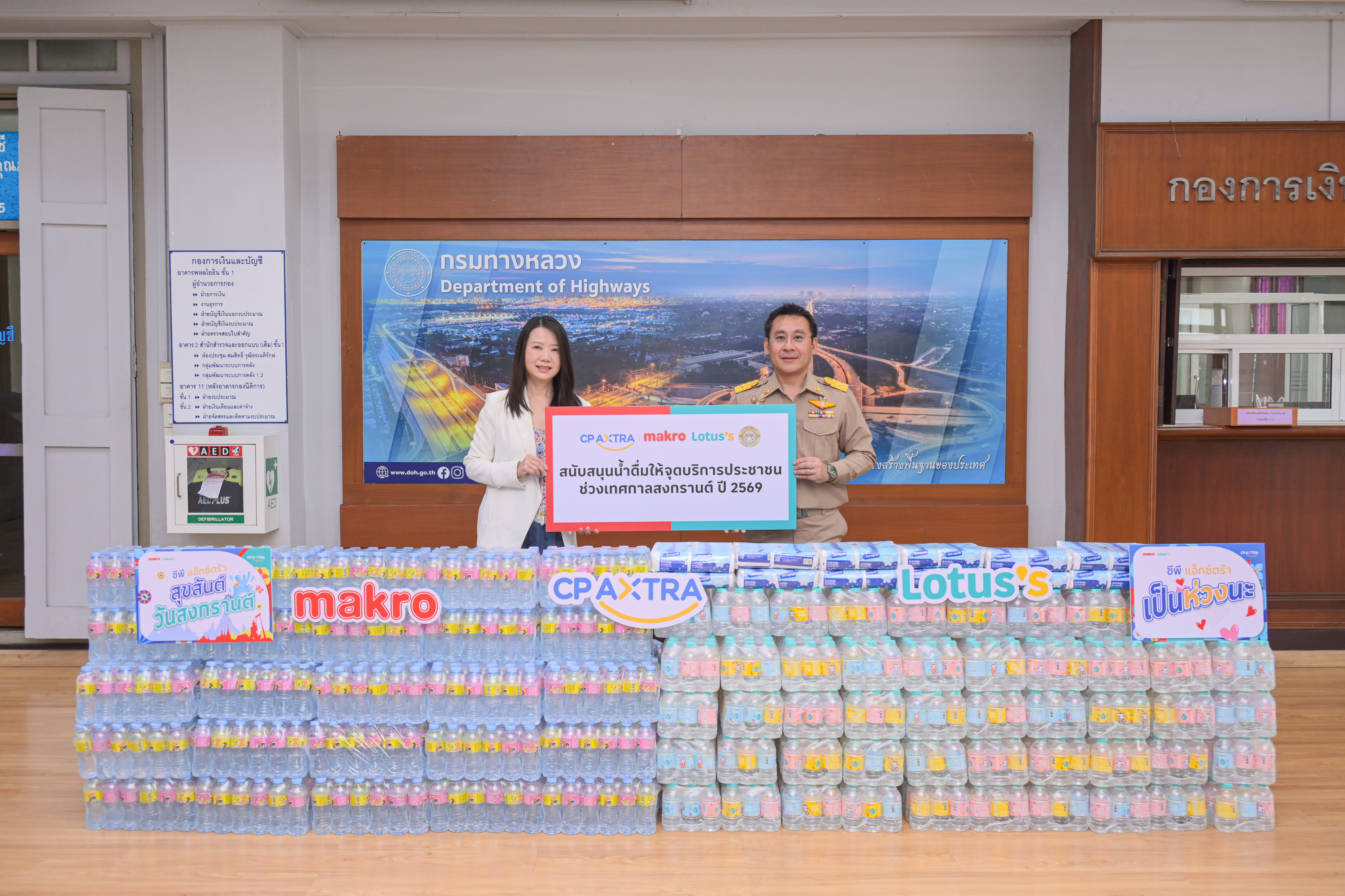 กรมทางหลวง ขอขอบคุณ บริษัท ซีพี แอ็กซ์ตร้า จำกัด (มหาชน) ที่ให้การสนับสนุนเพื่อประโยชน์ของส่วนรวม โดยในช่วงเทศกาลสงกรานต์ 2569 นี้ กรมทางหลวงได้รับมอบน้ำดื่ม รวมจำนวน 3,000 แพ็ค กว่า 30,000 ขวด โดยจะแจกจ่ายไปยังจุดให้บริการประชาชนของกรมทางหลวง จำนวน 20 แห่งในเส้นทางหลัก ทั้งนี้ เพื่ออำนวยความสะดวกในการเดินทางช่วงเทศกาลสงกรานต์กรมทางหลวงได้จัดเตรียมจุดบริการประชาชนเพื่อรองรับการเดินทางทั่วประเทศ จำนวน 127 จุด พร้อมเจ้าหน้าที่คอยให้บริการข้อมูลเส้นทาง ห้องน้ำสะอาด บริการน้ำดื่มและขนม ตลอด 24 ชั่วโมง
