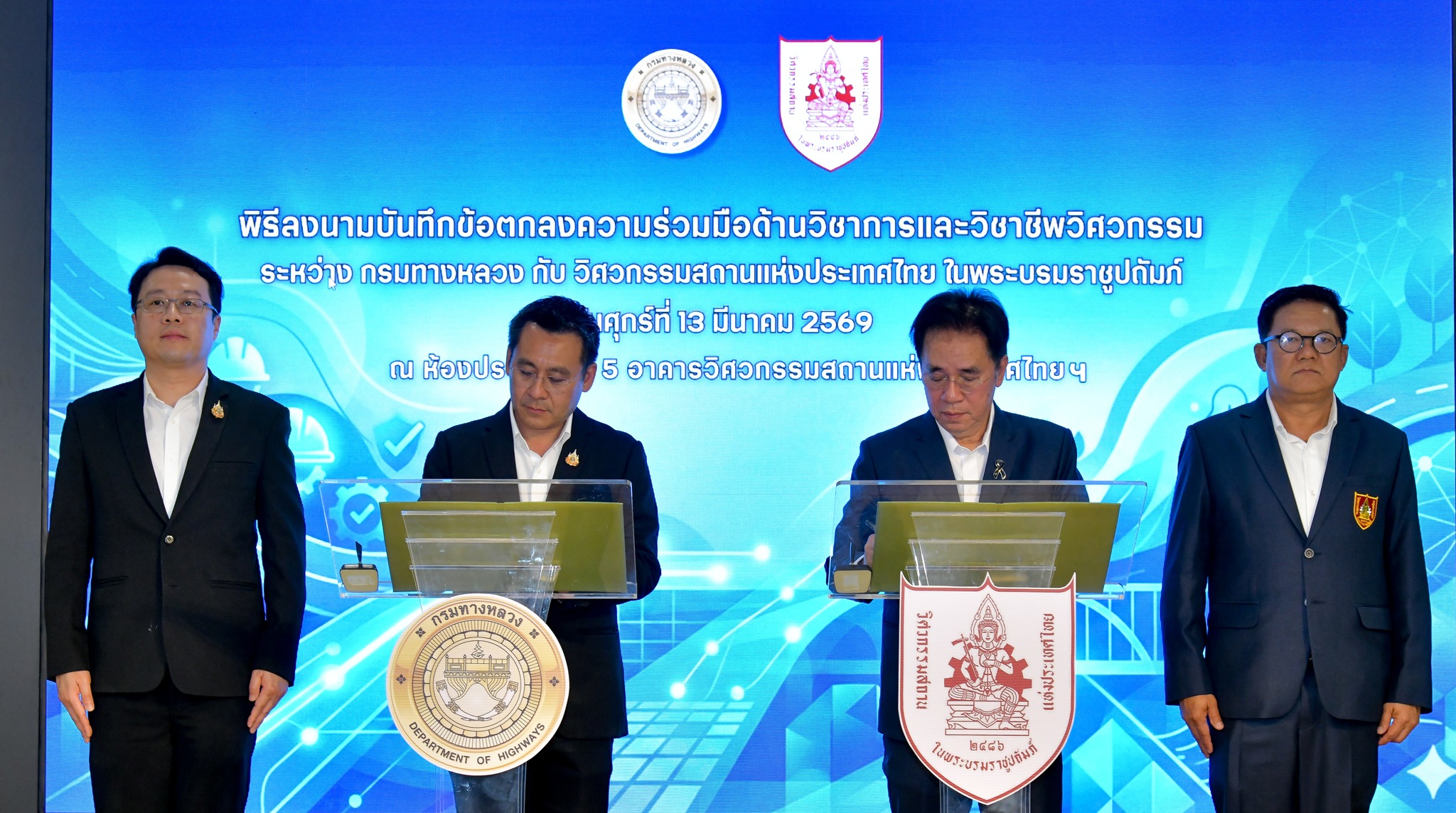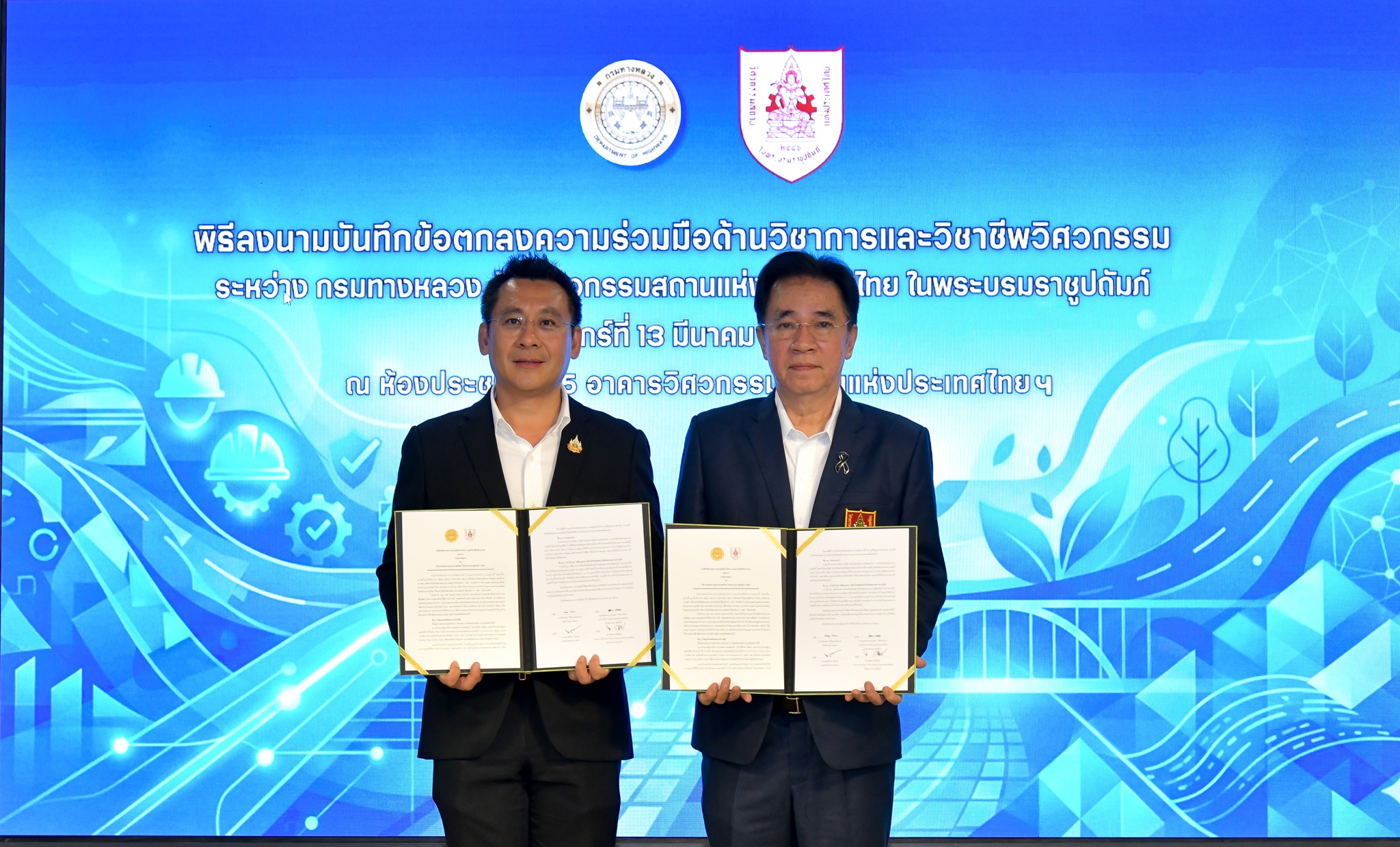 การลงนามในครั้งนี้ ได้รับเกียรติจาก นายปิยพงษ์ จิวัฒนกุลไพศาล อธิบดีกรมทางหลวง และ รองศาสตราจารย์เอนก ศิริพานิชกร นายกวิศวกรรมสถานแห่งประเทศไทย ในพระบรมราชูปถัมภ์ เป็นผู้ลงนามในบันทึกข้อตกลงความร่วมมือดังกล่าว