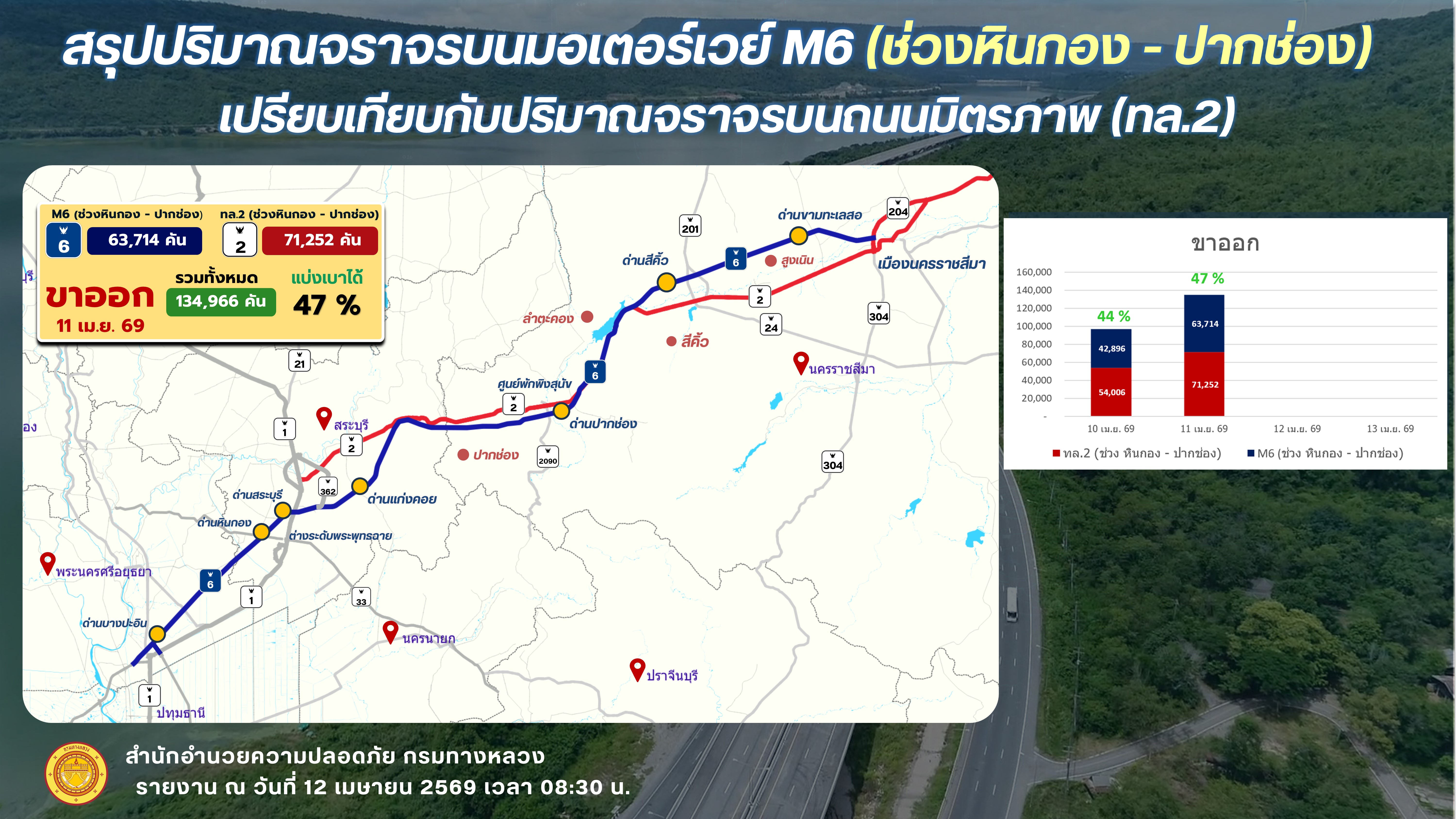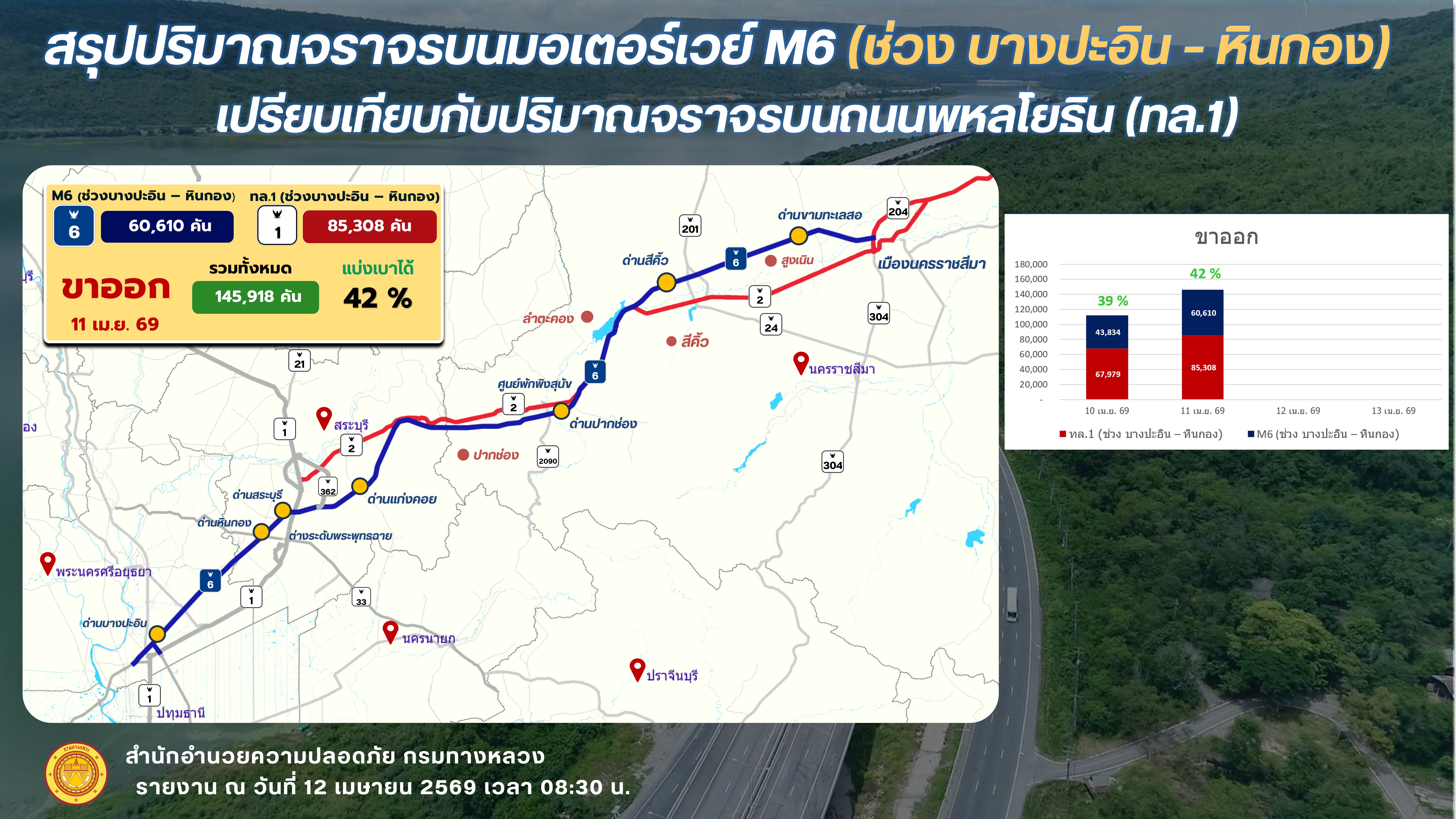 กรมทางหลวง สำนักอำนวยความปลอดภัยเปิดเผยว่า ปริมาณจราจรจากการเปิดให้บริการมอเตอร์เวย์ M6 สายบางปะอิน – นครราชสีมา ในวันที่ 11 เมษายน 2569 ซึ่งเป็นช่วงเริ่มต้นเทศกาลสงกรานต์ พบว่ามีปริมาณจราจรใช้เส้นทางอย่างต่อเนื่อง และสามารถช่วยแบ่งเบาการจราจรบนทางหลวงสายหลักได้อย่างมีประสิทธิภาพ