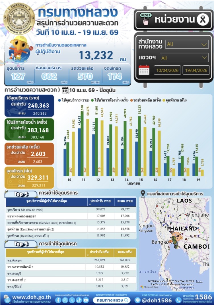 ได้มีจุดบริการ 127 แห่ง ห้องน้ำบริการ 662 แห่ง รถช่วยเหลือฉุกเฉิน 570 คัน จุดพักรถ 174 แห่ง โดยตั้งแต่วันที่ 10 เม.ย. 69 - 19 เม.ย. 69 พบว่า มีสถิติผู้ใช้งานจุดบริการ 240,363 ราย ใช้บริการห้องน้ำ จำนวน 383,148 ครั้ง รถช่วยเหลือฉุกเฉิน จำนวน 2,603 ครั้ง และใช้บริการจุดพักรถ 329,311 คัน