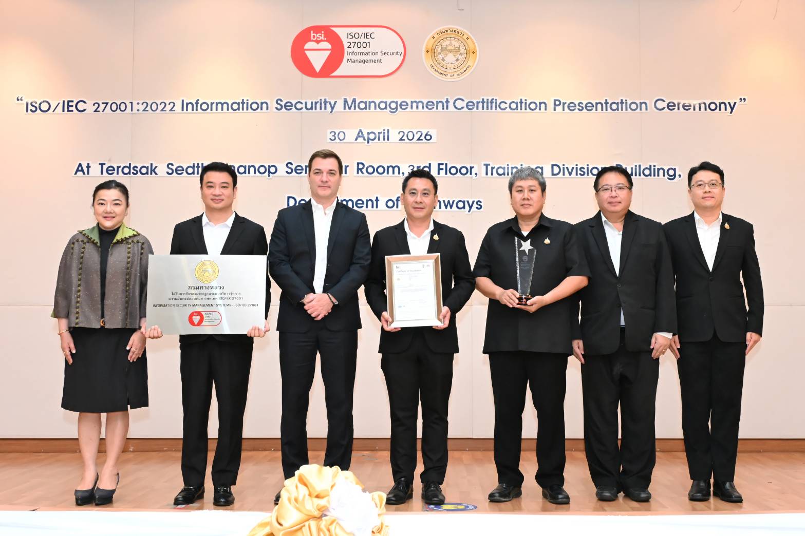 นายปิยพงษ์ จิวัฒนกุลไพศาล อธิบดีกรมทางหลวง เป็นประธานพิธีรับมอบใบรับรองมาตรฐานระบบบริหารจัดการความมั่นคงปลอดภัยสารสนเทศ ISO/IEC 27001:2022 อย่างเป็นทางการ ยืนยันความพร้อมในการปกป้องข้อมูลสำคัญและการให้บริการประชาชนภายใต้มาตรฐานความปลอดภัยทางไซเบอร์ระดับโลก โดยมีนายปรีชาพร สุวัฒโนดม ผู้อำนวยการศูนย์เทคโนโลยีสารสนเทศ กรมทางหลวง กล่าวรายงานความเป็นมาและสาระสำคัญของการรับรองมาตรฐาน ณ ห้องสัมมนาเทิดศักดิ์ เศรษฐมานพ ชั้น 3 อาคาร 6 กรมทางหลวง ซึ่งได้รับเกียรติจากMr.Emmanuel Herve Managing Director, ASEAN – Assurance – APAC Leadership Team (BSI) มอบใบรับรองมาตรฐาน ISO/IEC 27001:2022 และป้ายมาตรฐาน พร้อมกล่าวแสดงความยินดี และน.ส.อธิตานันท์ อภิธนทวีพัฒน์ กรรมการผู้จัดการ บริษัท เอเชี่ยน อินเทลลีเจนท์ อินฟอร์เมชั่น เทคโนโลยี จำกัด มอบโล่มาตรฐาน ISO/IEC 27001:2022 และช่อดอกไม้ พร้อมกล่าวแสดงความยินดี