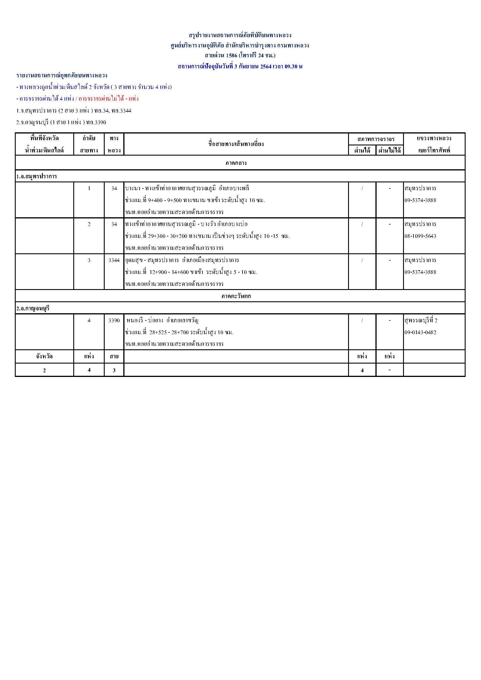 กรมทางหลวงขอรายงานสถานการณ์ น้ำท่วม และดินสไลด์ ในโครงข่ายทางหลวง วันศุกร์ที่ 3 กันยายน 2564 เวลา 09.30 น. ดังนี้