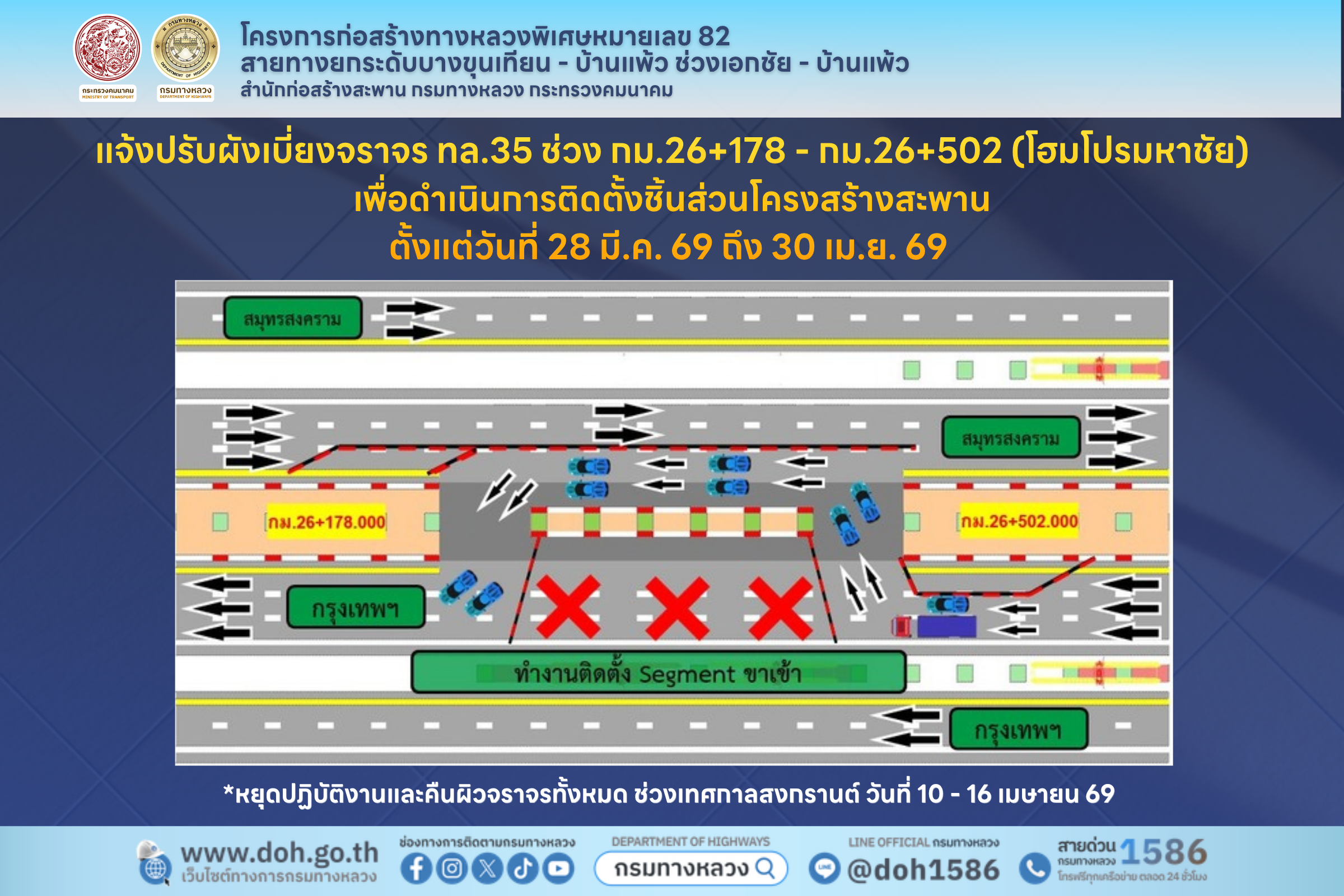 แจ้งเลี่ยง! กรมทางหลวงปรับทิศทางเบี่ยงพระราม 2 (กม.26) ขาเข้า เริ่ม 28 มี.ค. นี้ ย้ำ! ทางหลักวิ่งได้ปกติฝั่งละ 2 ช่อง กลางคืนปิด 100% ให้ใช้ทางขนาน