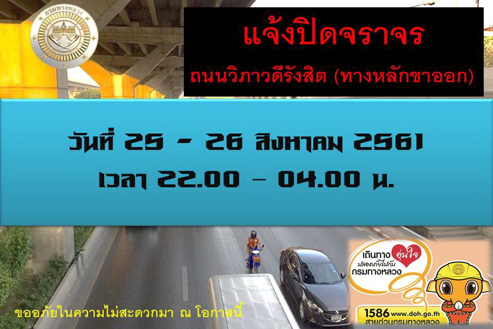 กรมทางหลวง แจ้งปิดจราจรถนนวิภาวดีรังสิต (ทางหลักขาออก) วันที่ 23 - 31 ส.ค.นี้ เพื่อทำการปรับปรุงผิวจราจร