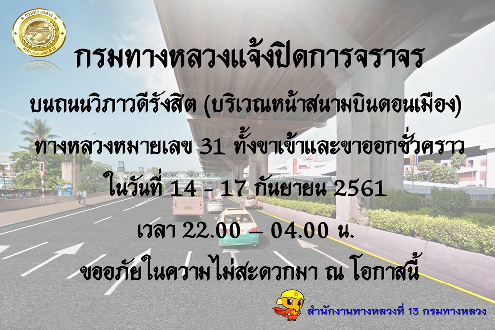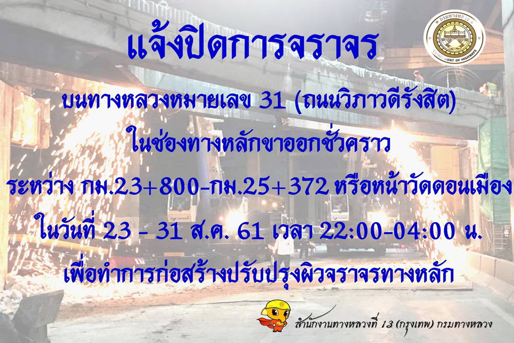 กรมทางหลวง แจ้งปิดจราจรถนนวิภาวดีรังสิต (ทางหลักขาออก) วันที่ 23 - 31 ส.ค.นี้ เพื่อทำการปรับปรุงผิวจราจร