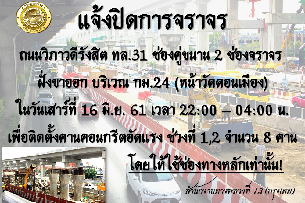 16 มิ.ย. นี้ กรมทางหลวง แจ้งปิดการจราจรบนถนนวิภาวดีรังสิต กม.24 เพื่อทำการติดตั้งคานคอนกรีตอัดแรง