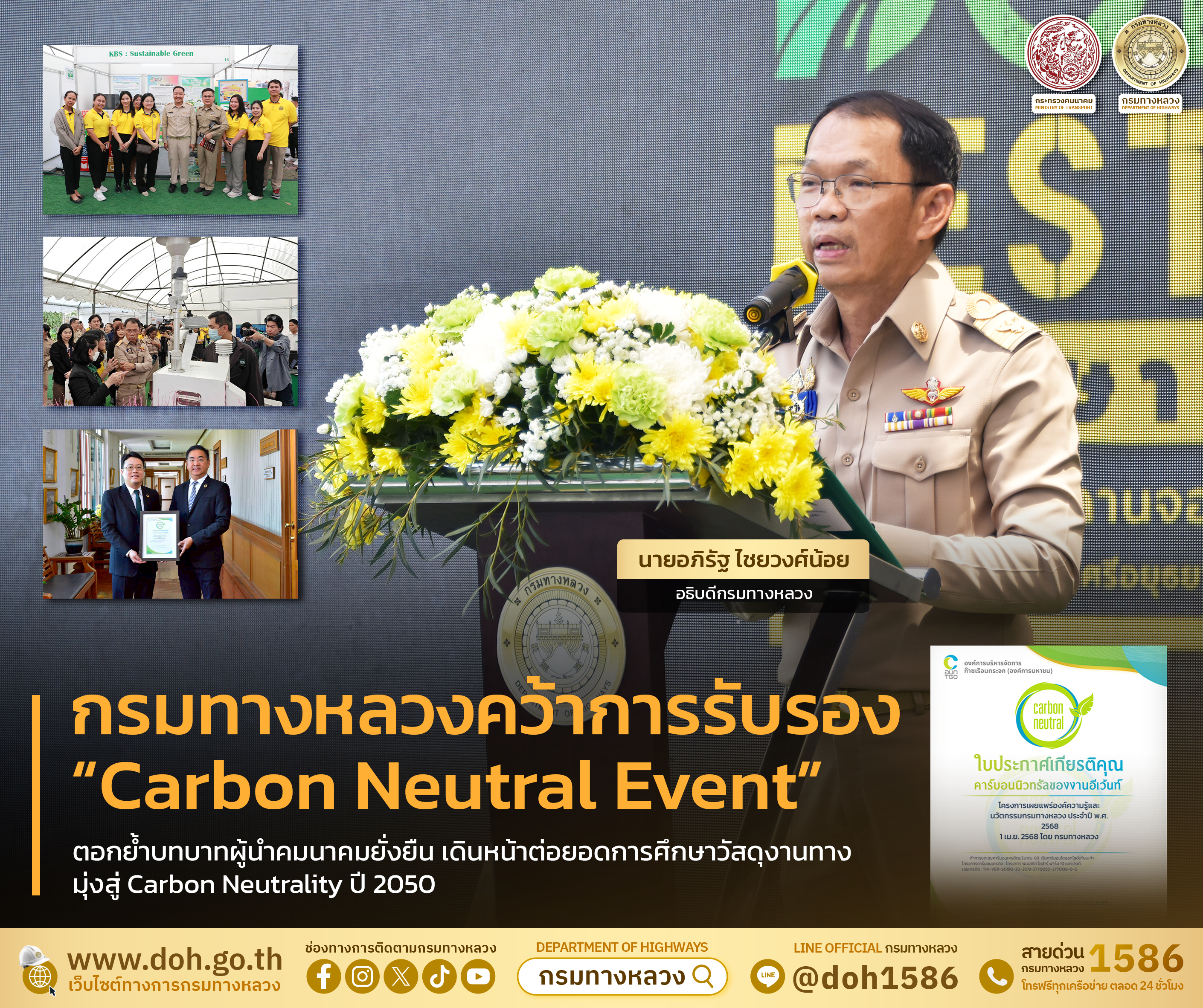 กรมทางหลวงคว้าการรับรอง “Carbon Neutral Event” ตอกย้ำบทบาทผู้นำคมนาคมยั่งยืน เดินหน้าต่อยอดการศึกษาวัสดุงานทาง มุ่งสู่ Carbon Neutrality ปี 2050
