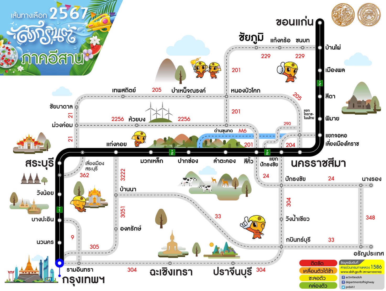 กรมทางหลวงแนะนำเส้นทางเลือกช่วงเทศกาลสงกรานต์ 2567 เพื่อให้ผู้ใช้ทางได้รับความสะดวกรวดเร็วในการเดินทาง สอบถามสภาพจราจรโทร 1586