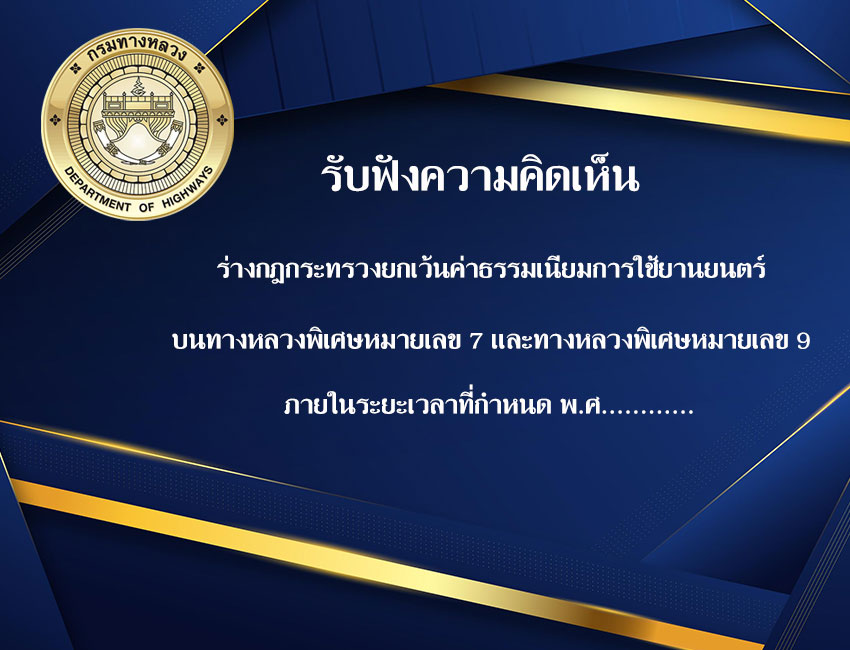 ขอเชิญร่วมแสดงความคิดเห็นร่างกฎกระทรวงยกเว้นค่าธรรมเนียมการใช้ยานยนตร์บนทางหลวงพิเศษหมายเลข 7 และทางหลวงพิเศษหมายเลข 9 ภายในระยะเวลาที่กำหนด (ฉบับที่...) พ.ศ....