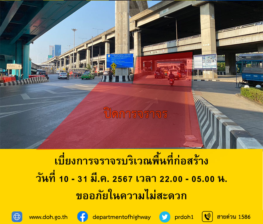 กรมทางหลวง ขอแจ้งประชาสัมพันธ์ปิดถนนใต้สะพานข้ามเเยกดินแดง - ลาดพร้าว/พหลโยธิน เพื่อดำเนินการเสริมกำลังสะพาน (Strengthening) ตั้งแต่เวลา 22:00 - 05:00 น. ระหว่างวันที่ 10 - 31 มีนาคม 2567