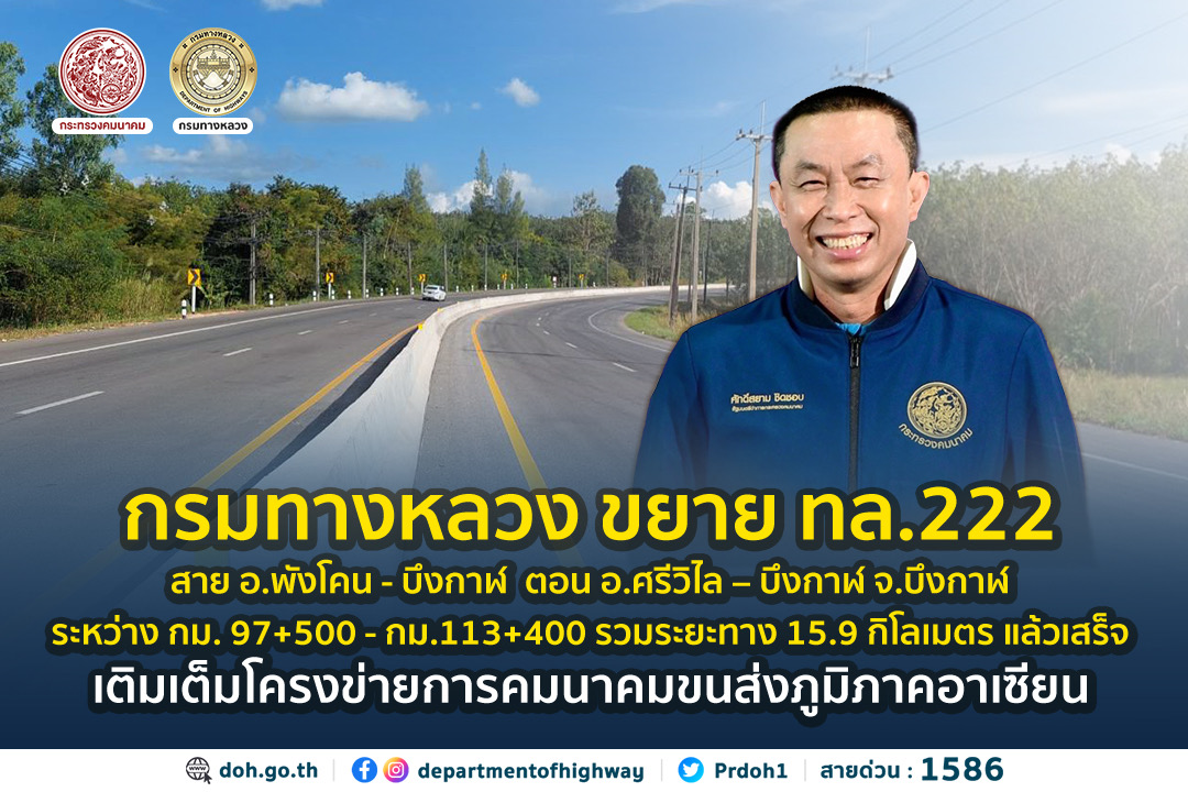 กรมทางหลวง ขยาย ทล. 222 สาย อ.พังโคน - จ.บึงกาฬ ตอน อ.ศรีวิไล – จ.บึงกาฬ แล้วเสร็จ เชื่อมโยงโลจิสติกส์ ภาคอีสาน - สะพานมิตรภาพไทย-ลาว แห่งที่ 5 เติมเต็มโครงข่ายการคมนาคมขนส่งภูมิภาคอาเซียน