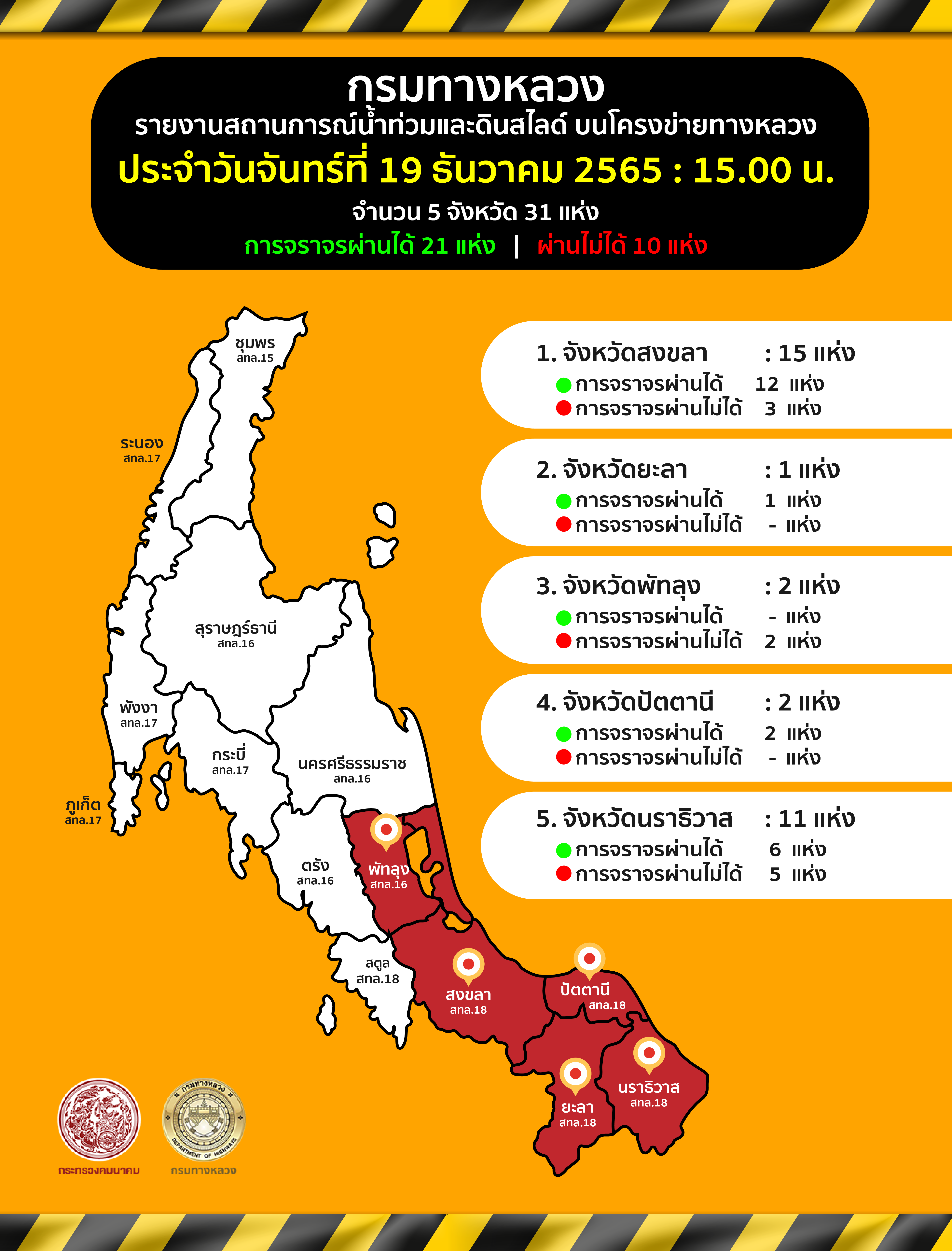 กรมทางหลวงรายงานสถานการณ์อุทกภัยในภาคใต้ ผ่านไม่ได้ 10 แห่ง พร้อมจัดเจ้าหน้าที่ช่วยเหลือประชาชนอย่างทันท่วงที