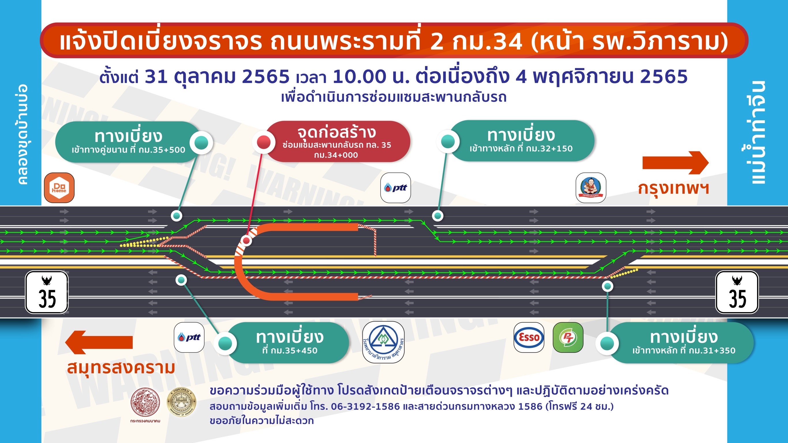 กรมทางหลวง แจ้งปิดเบี่ยงจราจร บนถนนพระรามที่ 2 กม.34 ตั้งแต่วันที่ 31 ตุลาคม 2565 เวลา 10.00 น. ต่อเนื่องถึง วันที่ 4 พฤศจิกายน 2565 เพื่อดำเนินการซ่อมแซมสะพานกลับรถ (หน้า รพ.วิภาราม) จังหวัดสมุทรสาคร