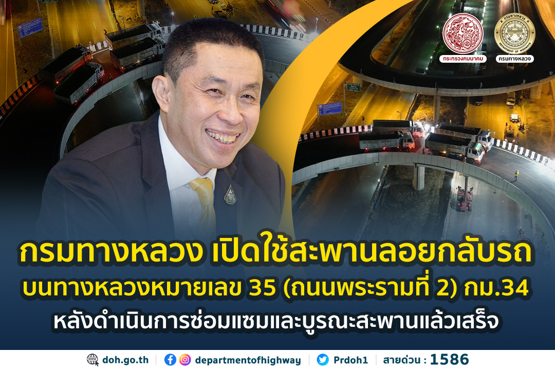 กรมทางหลวง เปิดใช้สะพานลอยกลับรถบนทางหลวงหมายเลข 35 (ถนนพระรามที่ 2) กม.34 หลังดำเนินการซ่อมแซมและบูรณะสะพานแล้วเสร็จ ด้าน วสท. ยืนยัน ผลทดสอบความสามารถในการรับน้ำหนักบรรทุกของสะพานเป็นไปตามมาตรฐานและที่กฎหมายกำหนด